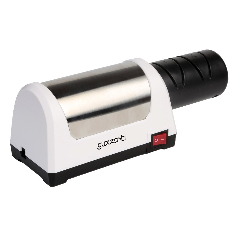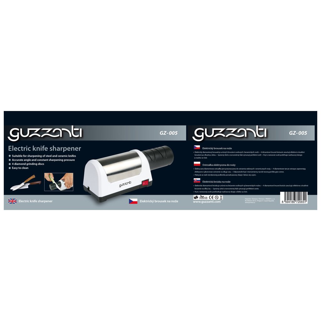 Elektrická bruska GZ 005 od italské značky Guzzanti je vhodný na broušení jak ocelových, tak i keramických nožů. Je vybavena čtyřmi diamantovými brusnými kotouči. Díky správnému úhlu a rovnoměrnému tlaku zůstanou vaše nože dlouhodobě bezchybně funkční.