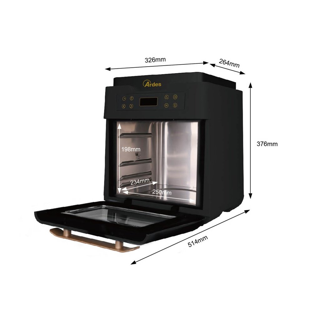 Rozměr horkovzdušné fritézy Ardes 1K3000: | 37,6 x 32,6 x 26,4 cm |