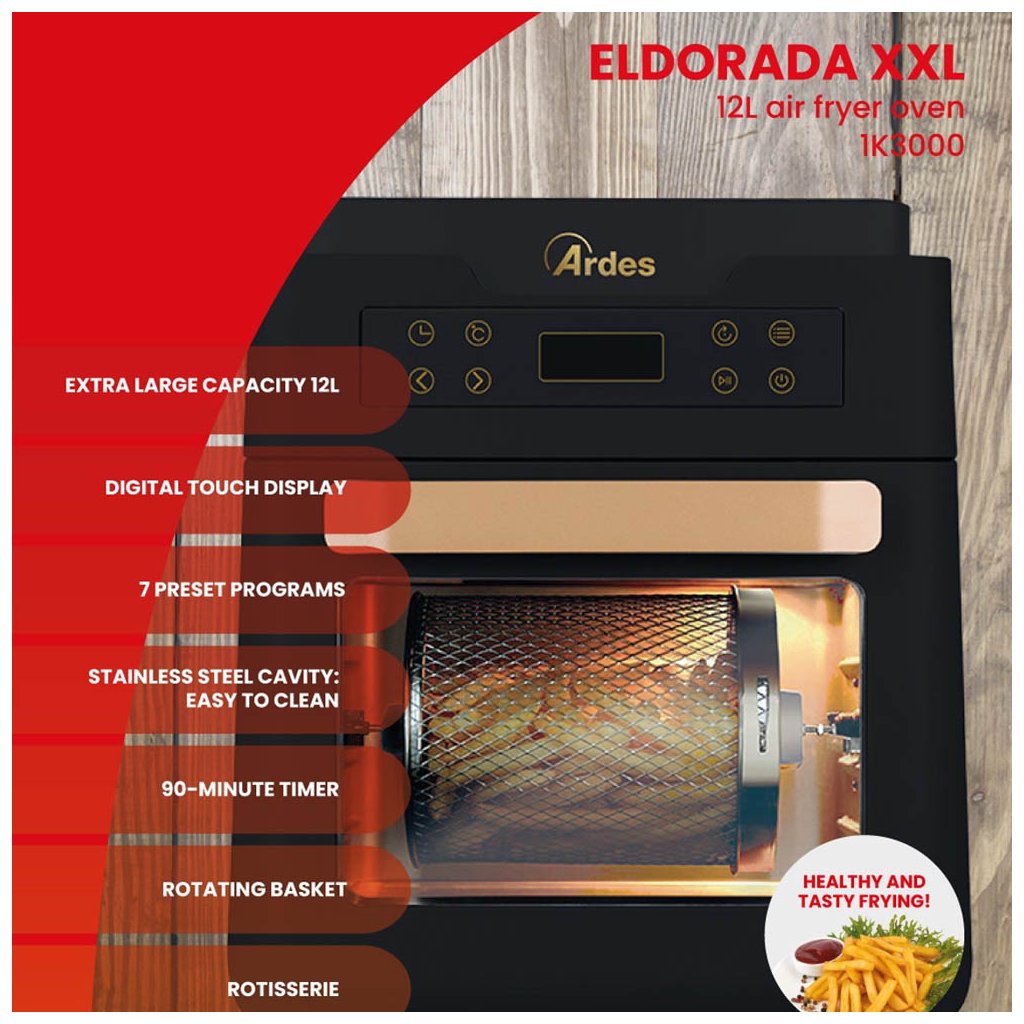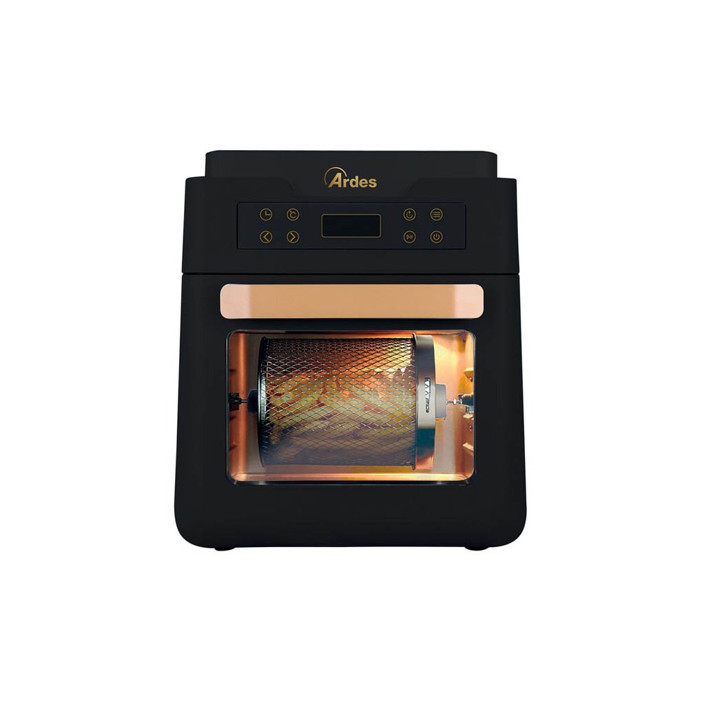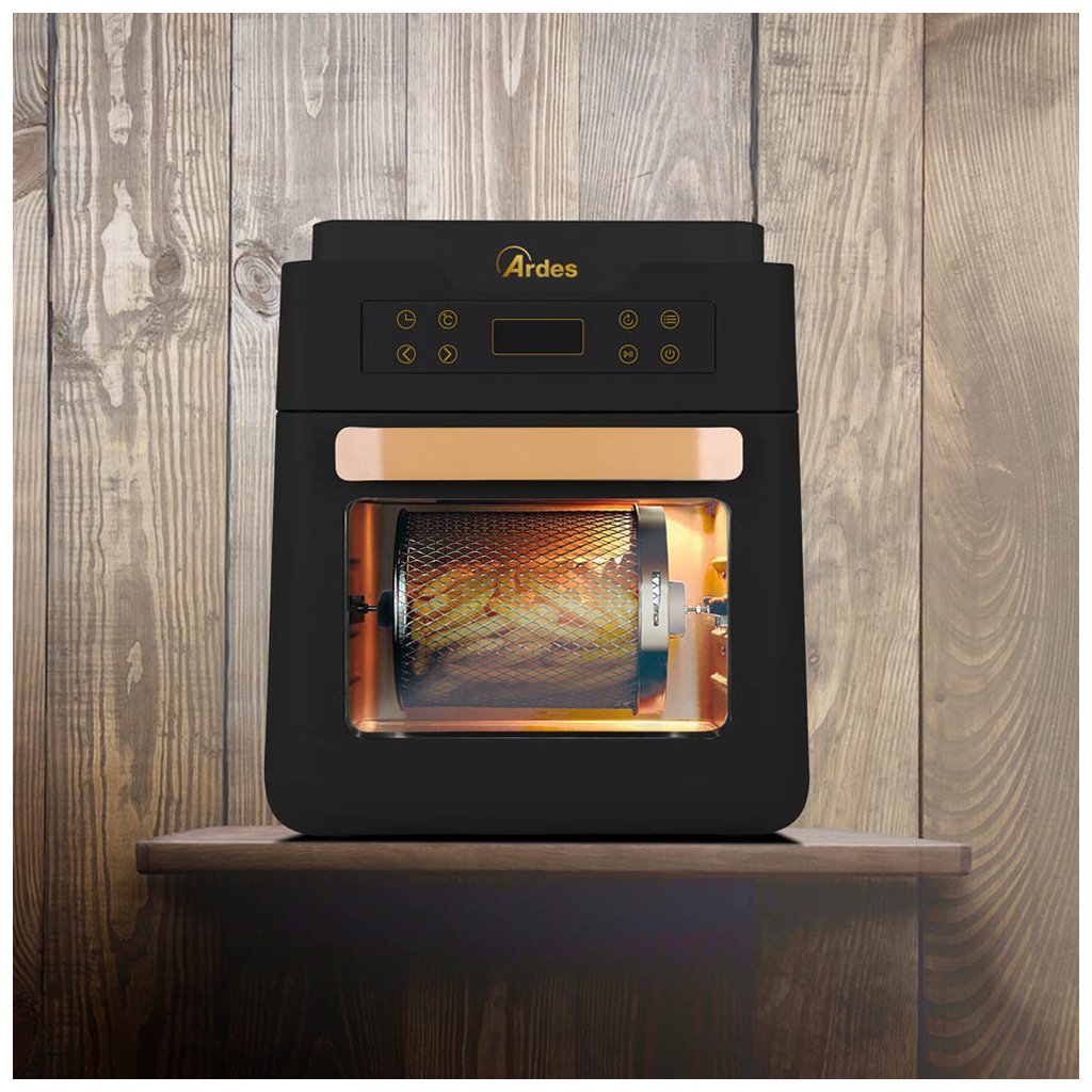 Horkovzdušná fritéza, pečící trouba a sušička ovoce 5v1 (horkovzdušná trouba, fritéza, barbecue / gril, toustovač a rozmrazování) 1K3000 od italského výrobce ARDES je vybavena technologii smažení horkým vzduchem, bez použití oleje nebo tuku. Smažit ve fritéze se dá zcela bez tuku nebo pouze s pár lžičkami tuku. Tím tato fritéza spotřebuje až o 80 % méně tuku než tradiční fritéza. Horký vzduch v jádru fritézy, s nastavitelnou teplotou od 60 °C po nejvyšších 200 °C, rychle a přesně cirkuluje a udržuje tak optimální teplotu grilovacího tělesa, které pokrmy následně peče, smaží či frituje. Ve fritéze si můžete připravit celou řadu pokrmů, například maso, ryby, krevety, celé kuře, smažené brambory či hranolky s minimem kouře a pachu.