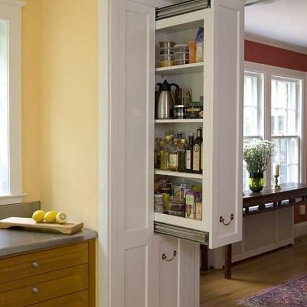 - rohovou spíží, pokud to dispozice kuchyně umožňuje. Zvenčí to vypadá jako vysoká kuchyňská dvířka, která jsou vstup do malé rohové místnosti s policemi.