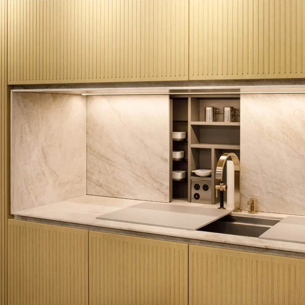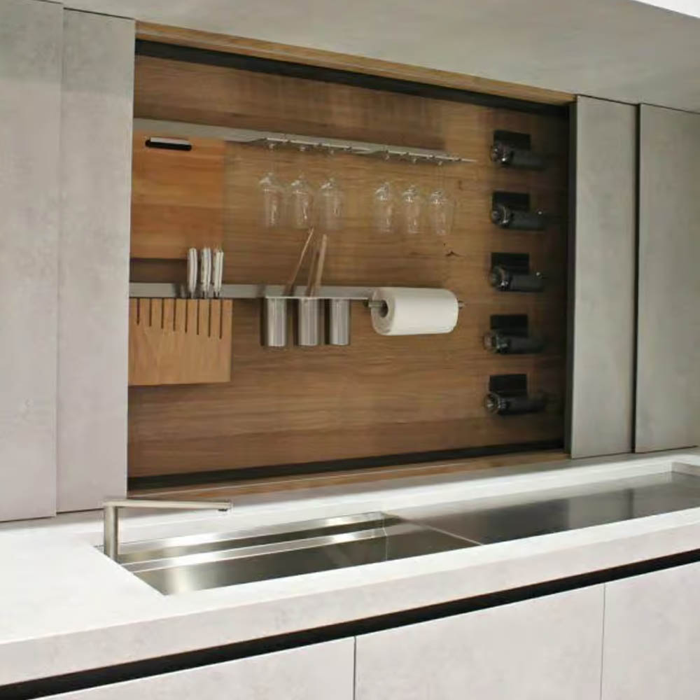 Doporučuji mít zasouvací (uzavíratelný) prostor za kuchyňskou linkou, tedy mezi horními a dolními skříňkami v místě, kde obvykle bývá obklad. Stačí kuchyň naplánovat s mírným odsazením do prostoru, ponechat za ní přibližně 25-30 cm. Tím se získá nejenom skrytý úložný zadní prostor, ale také hlubší horní i dolní skříňky. Tento prostor lze opatřit neprůhledným skleněným zasouvacím panelem a uložit do něj vše, co chcete mít po ruce, ale nechcete to mít na očích, tedy neustále vystavené na pracovní ploše. My tam doma máme saponáty, šťávu, hmoždíř, špejle, teploměr na vaření, ale i menší spotřebiče, jako je toastovač nebo mlýnek na kávu, jenž používáme jednou za čas.