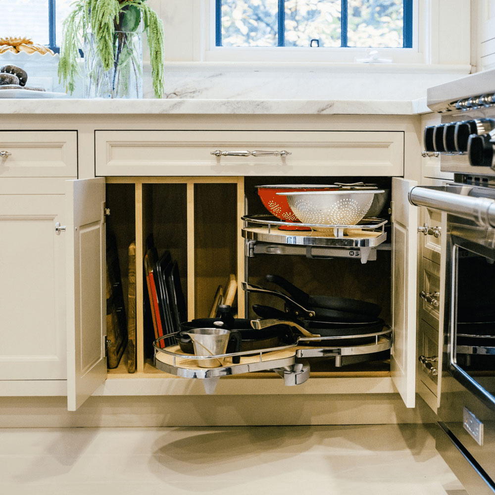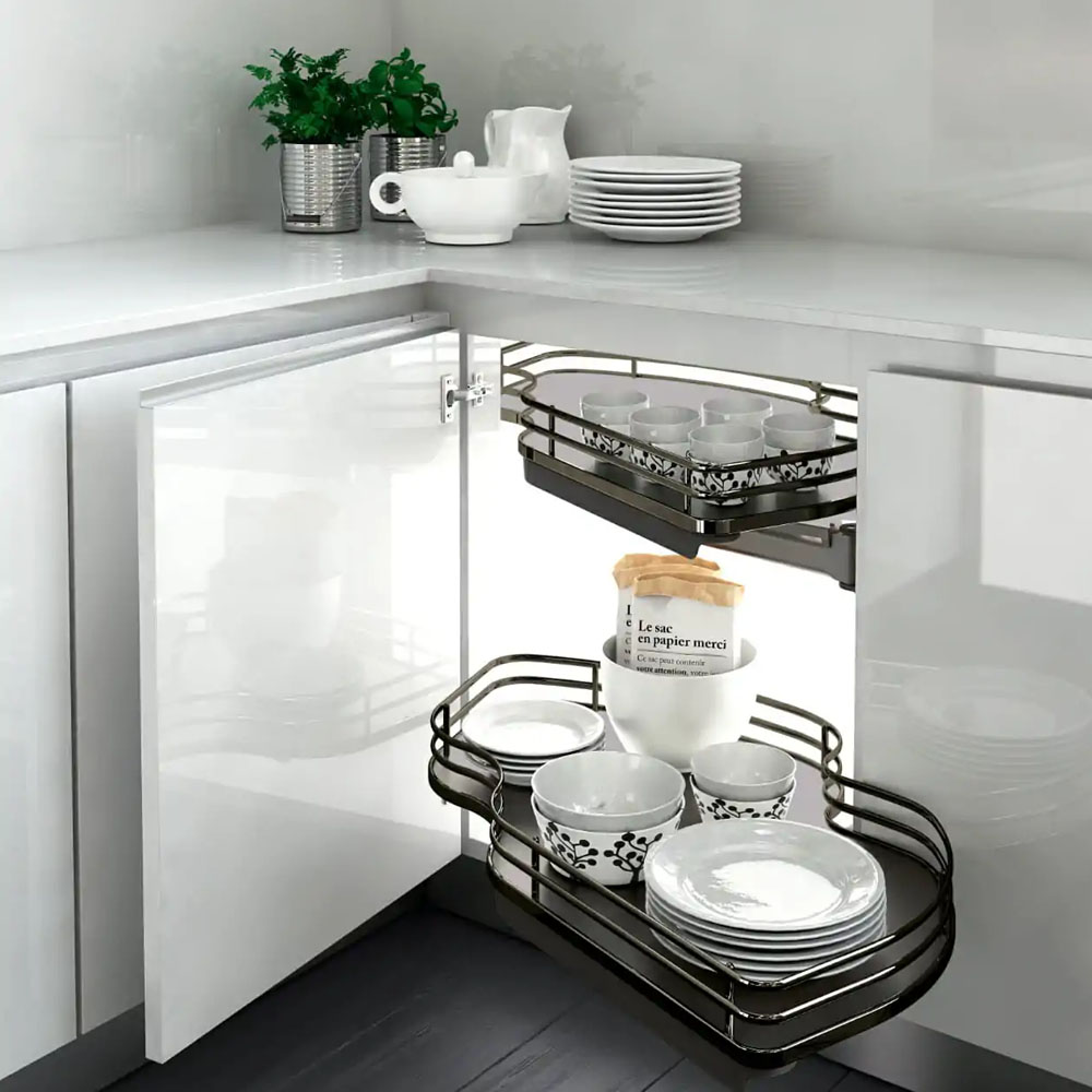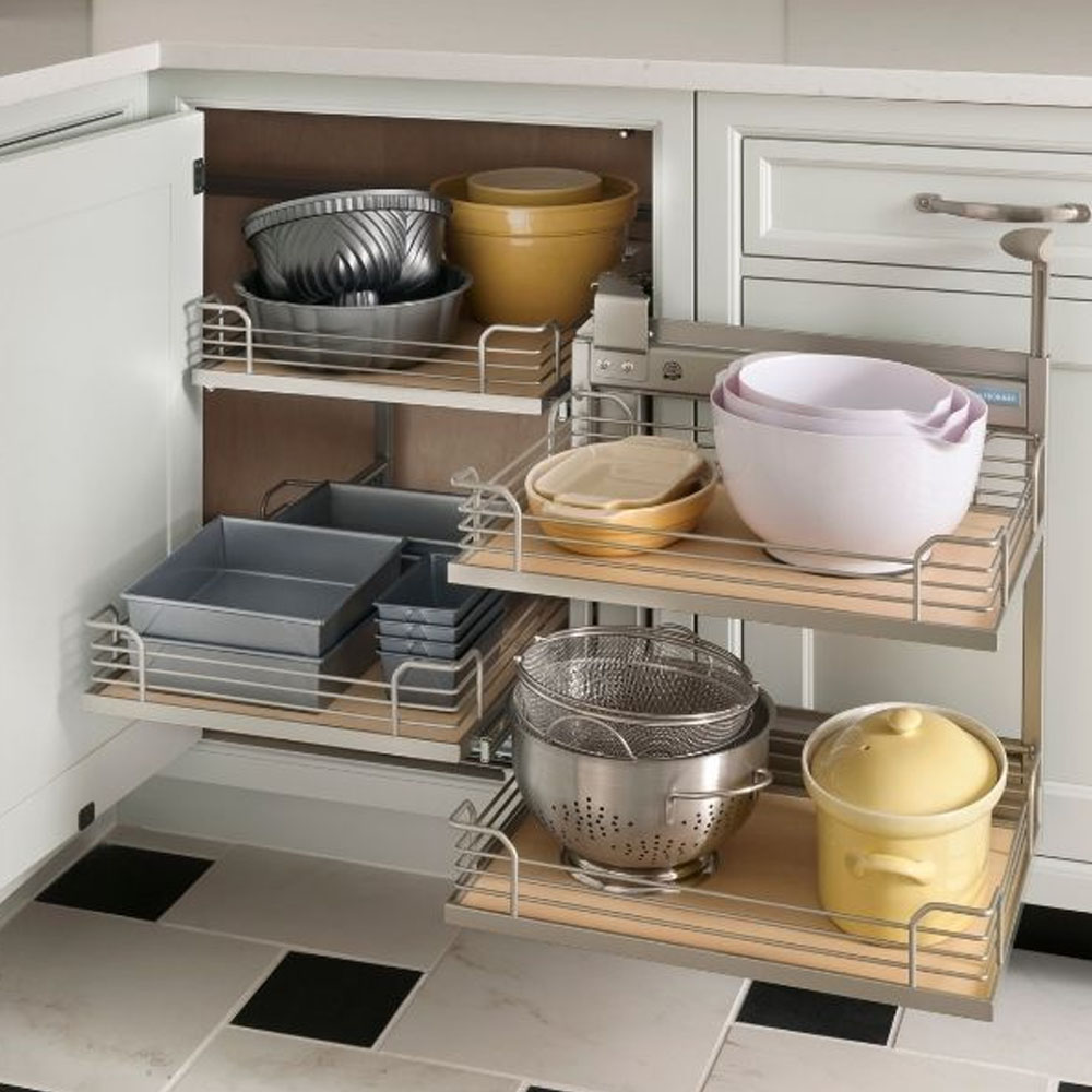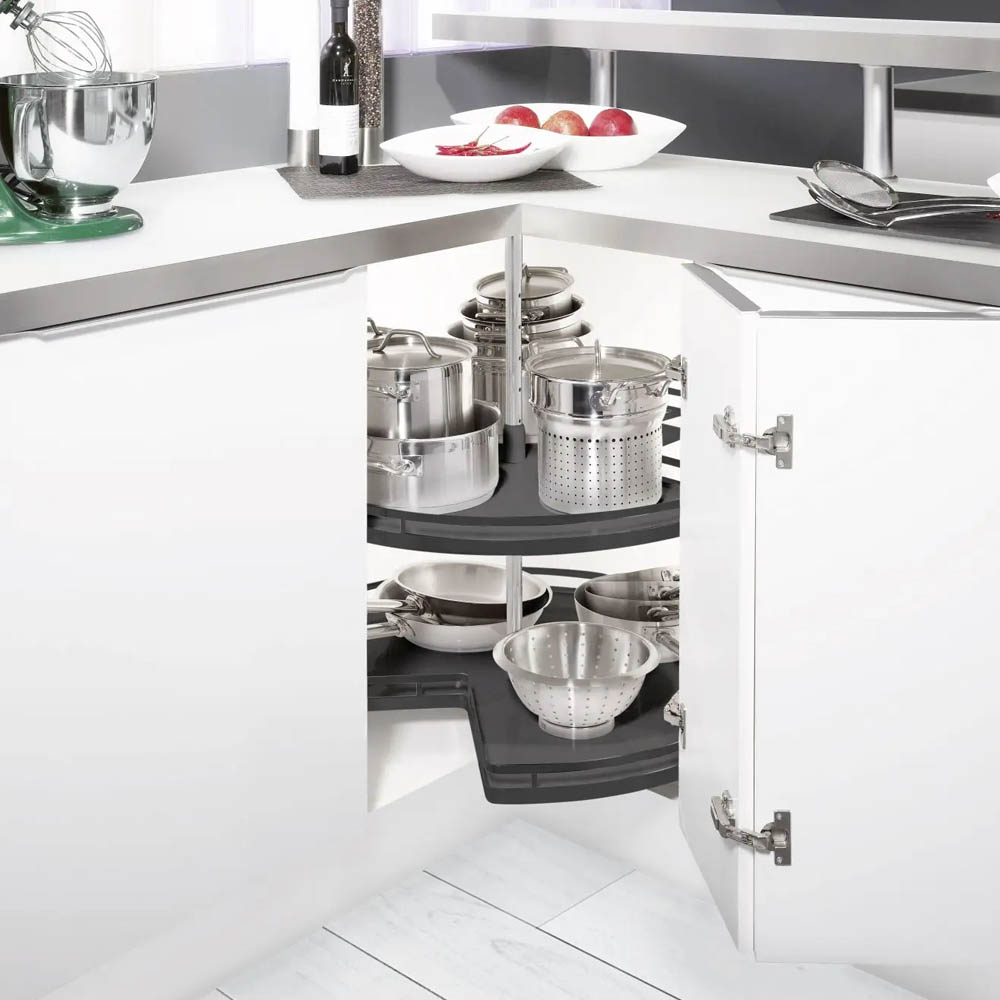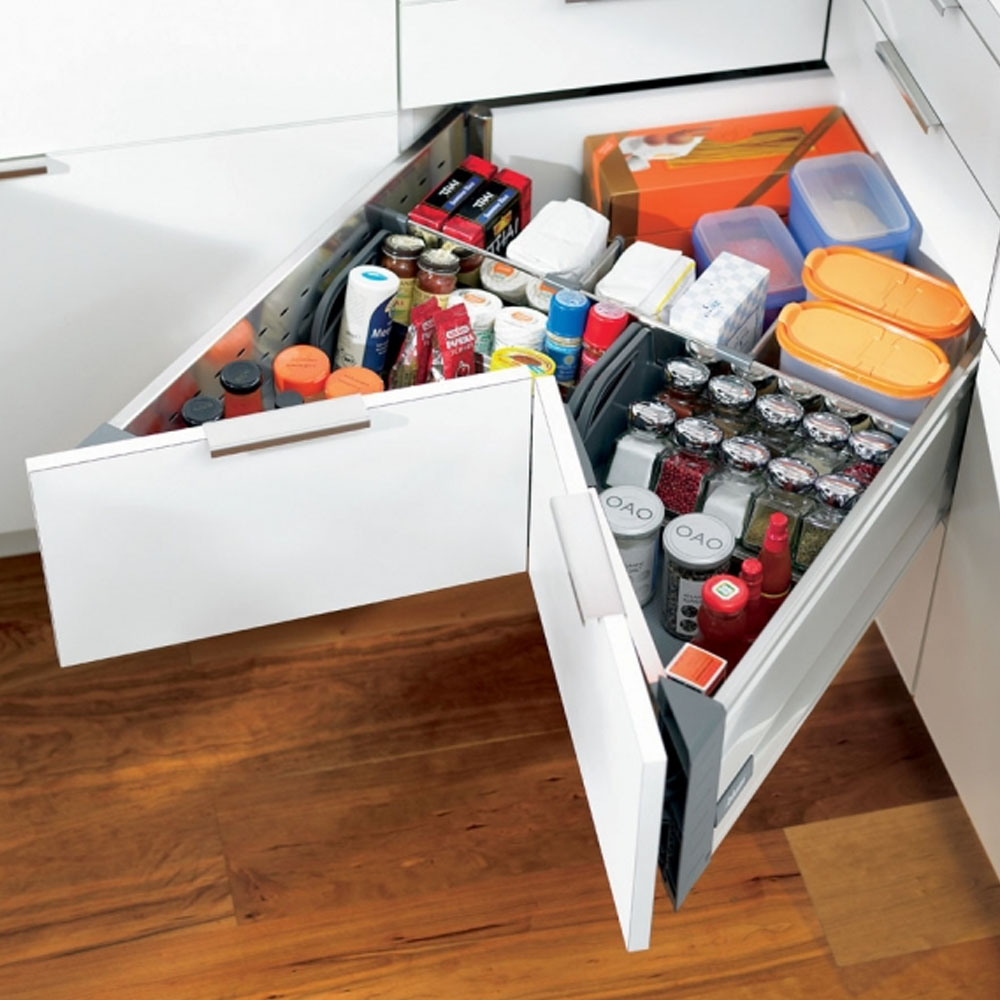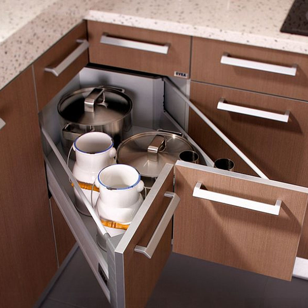 Hrnce a poklice se v kuchyni často umisťují do rohové spodní skříňky a jejich přehledné uspořádání pomáhají udržet výsuvné „ledvinky“. Jde o systém, který se při vysunutí částečně otočí a umožní pohodlný přístup k celému obsahu skříňky. Po zasunutí zároveň efektivně využije i „mrtvý“ roh v její zadní části.
