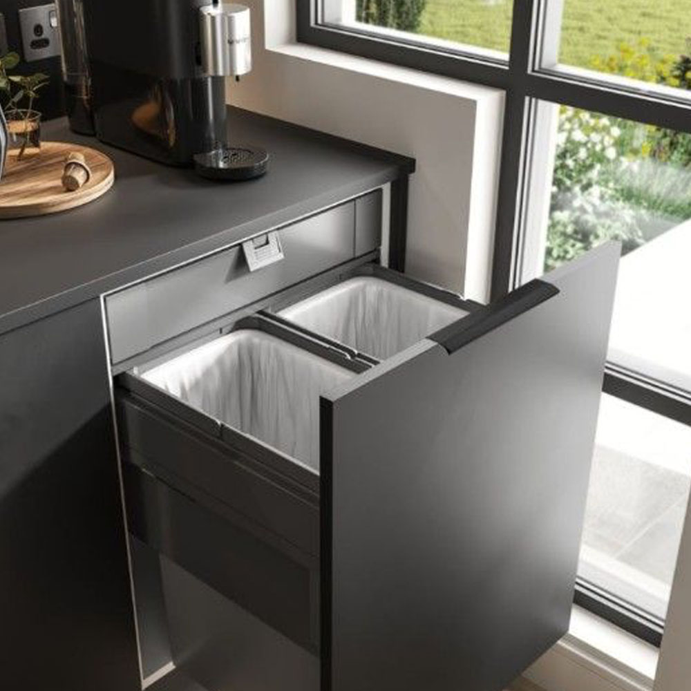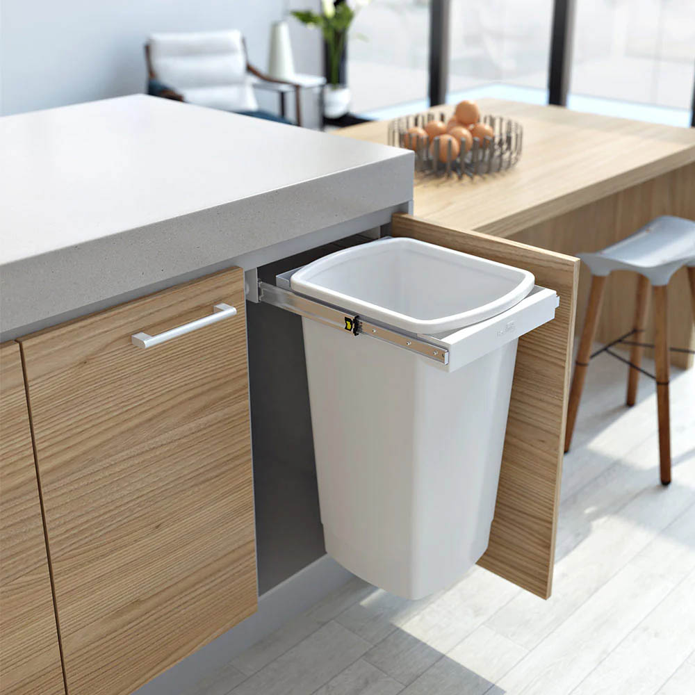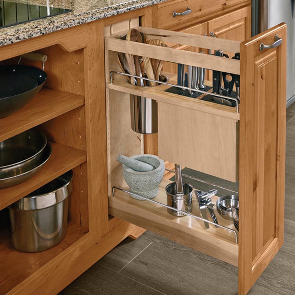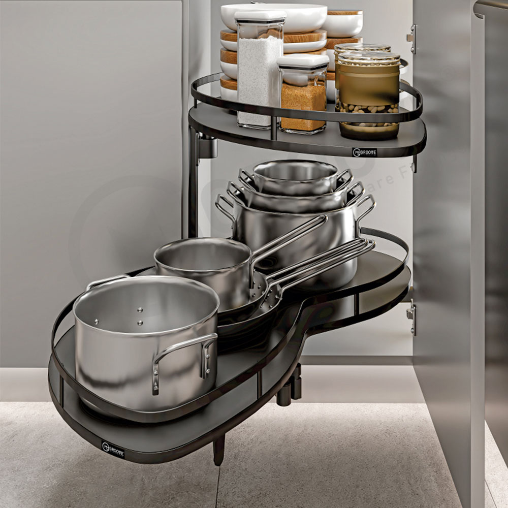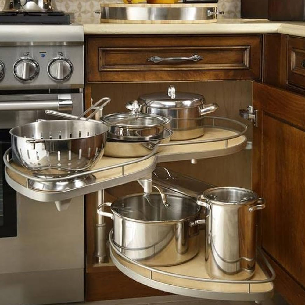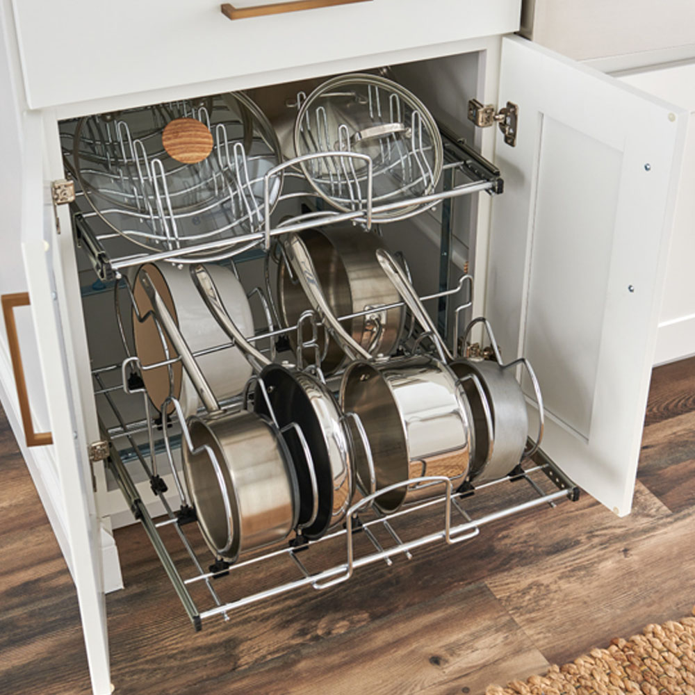 Hrnce a poklice se v kuchyni často umisťují do rohové spodní skříňky a jejich přehledné uspořádání pomáhají udržet výsuvné „ledvinky“. Jde o systém, který se při vysunutí částečně otočí a umožní pohodlný přístup k celému obsahu skříňky. Po zasunutí zároveň efektivně využije i „mrtvý“ roh v její zadní části.
