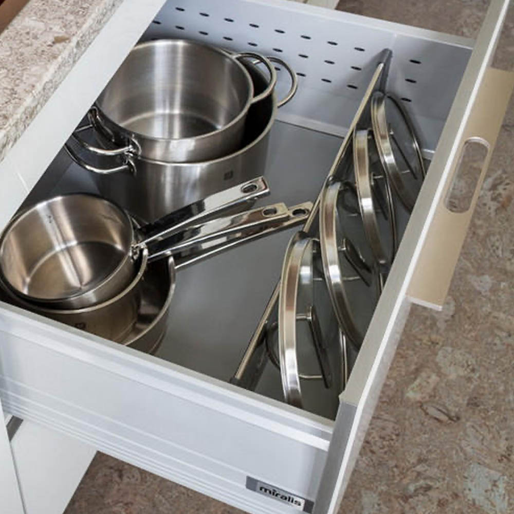 Hrnce a poklice patří mezi nejnáročnější kusy nádobí na skladování. V galerii níže najdete několik řešení, jak je uspořádat přehledně, úsporně a s ohledem na každodenní komfort.