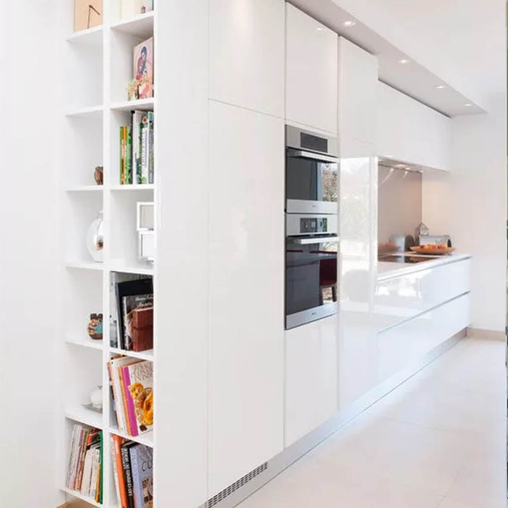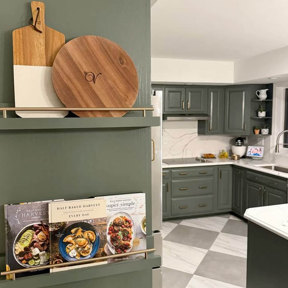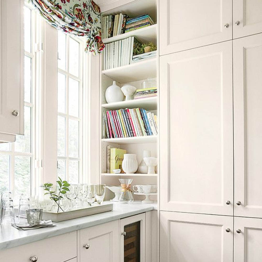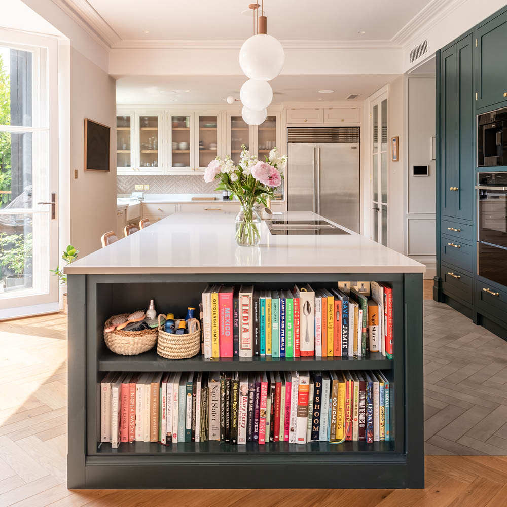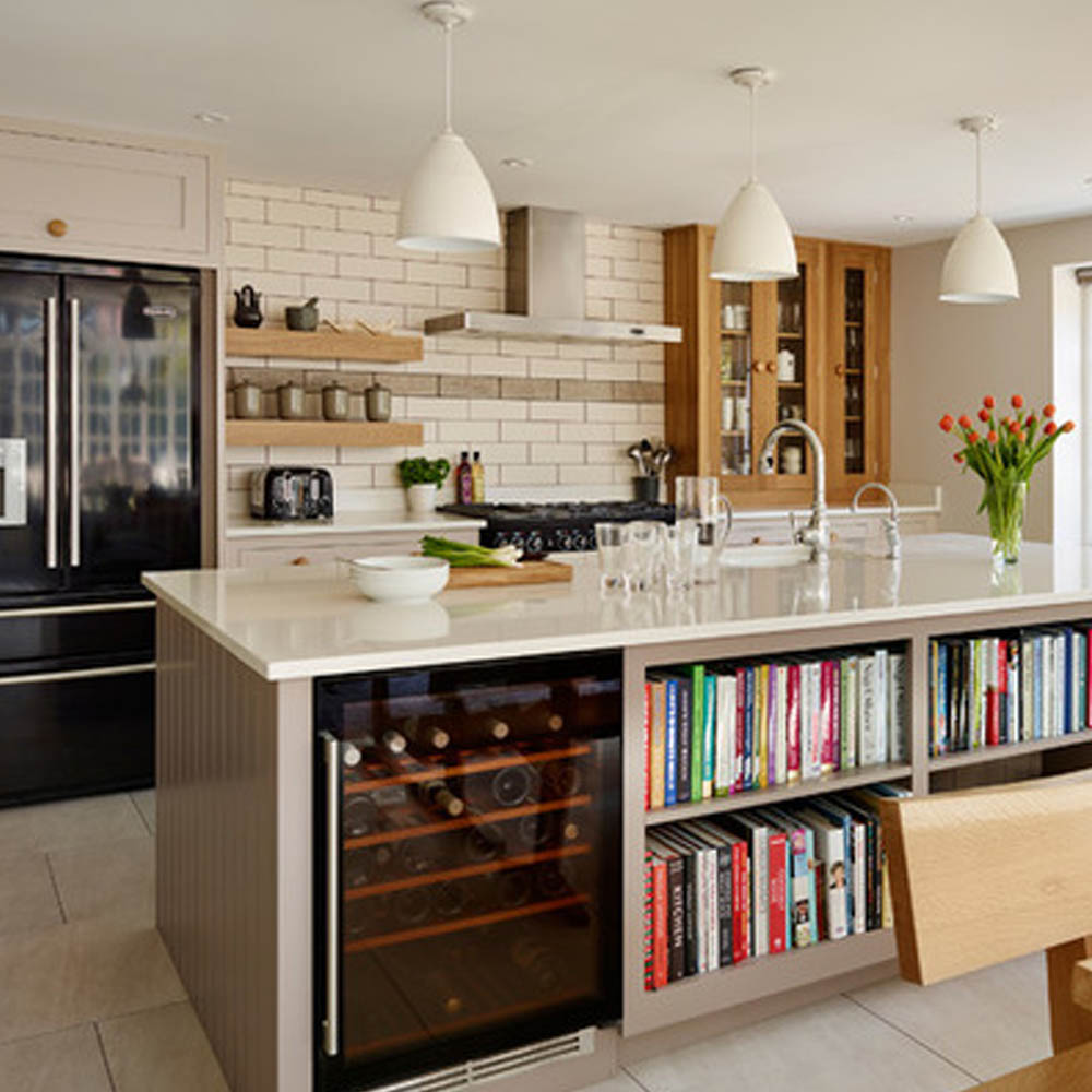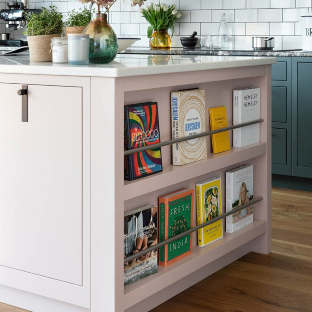 Nabízí se několik řešení: otevřené police na konci linky, mělká knihovna integrovaná do vysoké skříně, výklenek v ostrůvku nebo policový systém zapuštěný do boční stěny kuchyňské sestavy. Praktické je i vyhrazené místo ve špajzu, pokud knihy nepoužíváte denně.