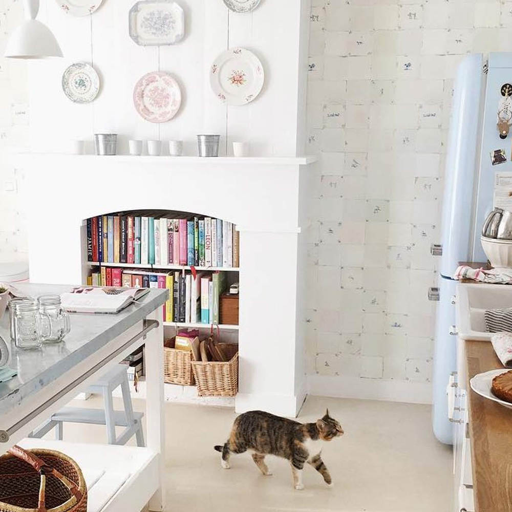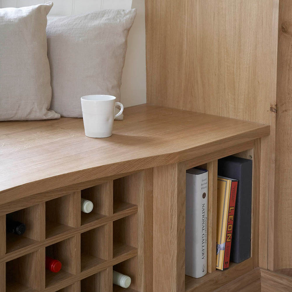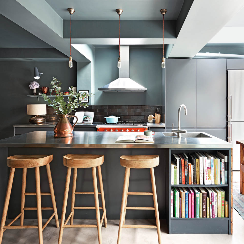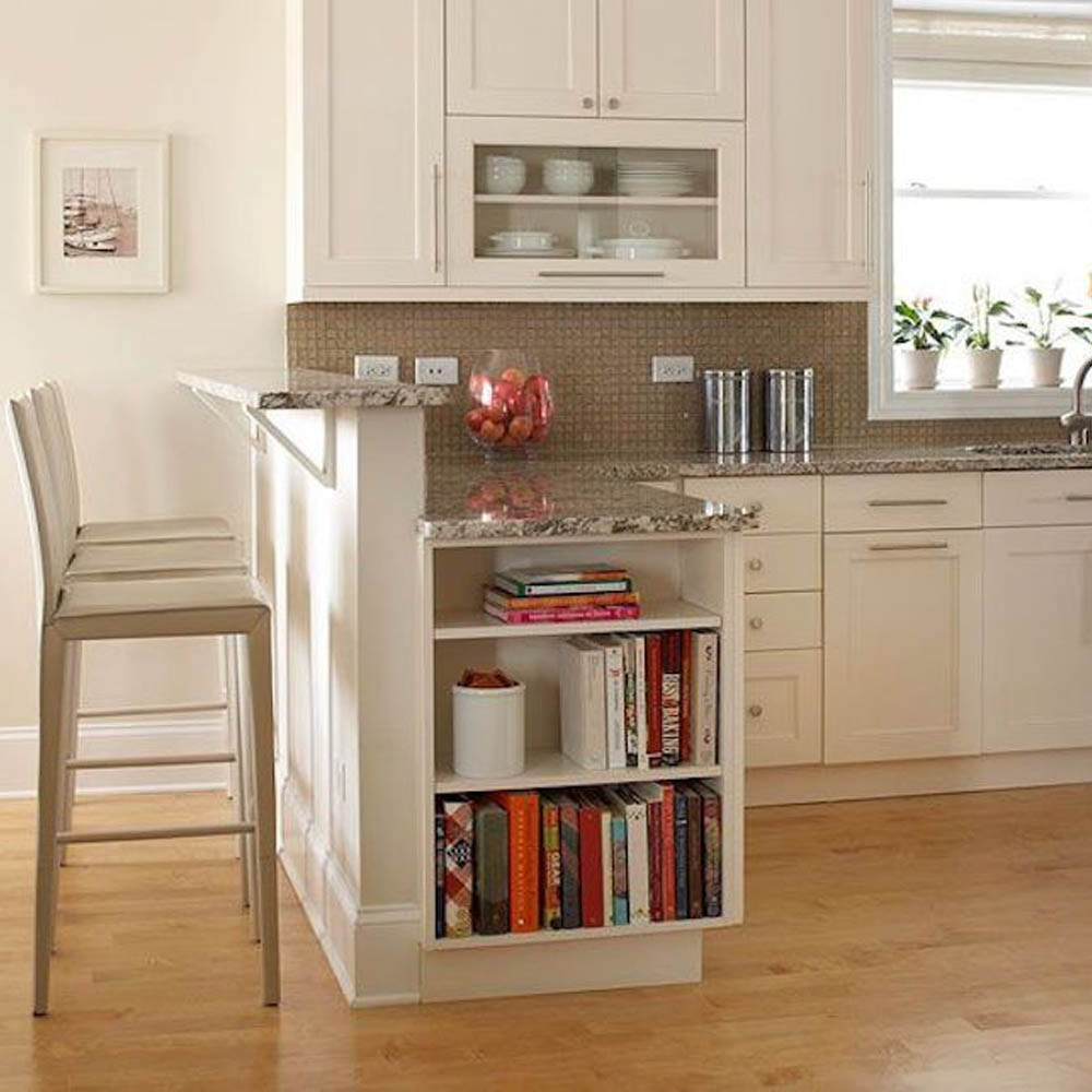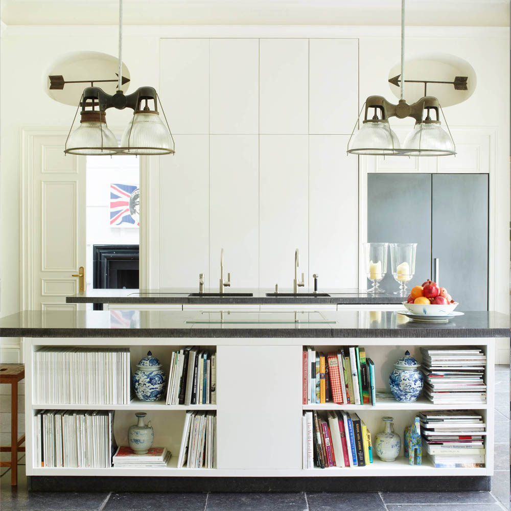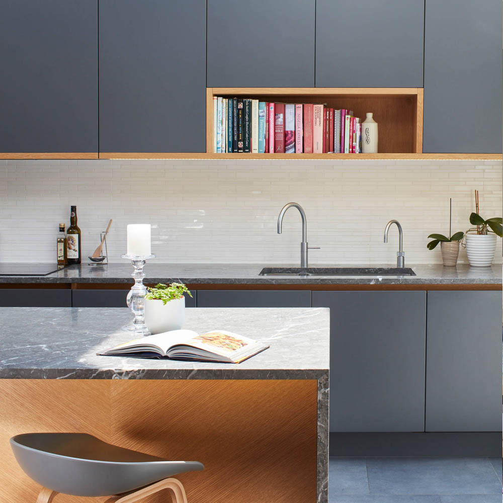 Nabízí se několik řešení: otevřené police na konci linky, mělká knihovna integrovaná do vysoké skříně, výklenek v ostrůvku nebo policový systém zapuštěný do boční stěny kuchyňské sestavy. Praktické je i vyhrazené místo ve špajzu, pokud knihy nepoužíváte denně.
