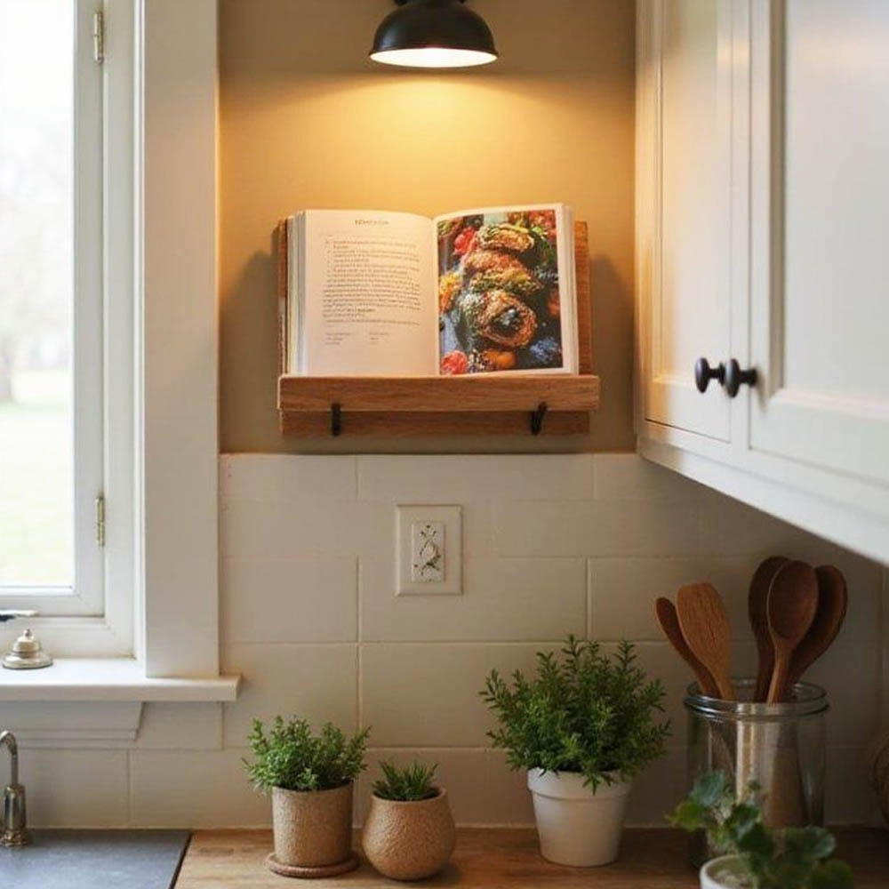 Skvělým pomocníkem může být také stojan na otevřenou knihu zapuštěný (vyklápěcí) ze spodní části horní skříňky nebo samostatný stojan na pracovní desce, který udrží knihu otevřenou a zároveň ji chrání před nečistotami.