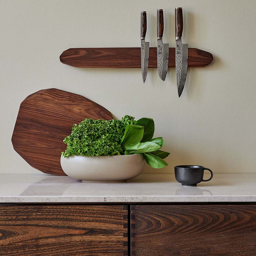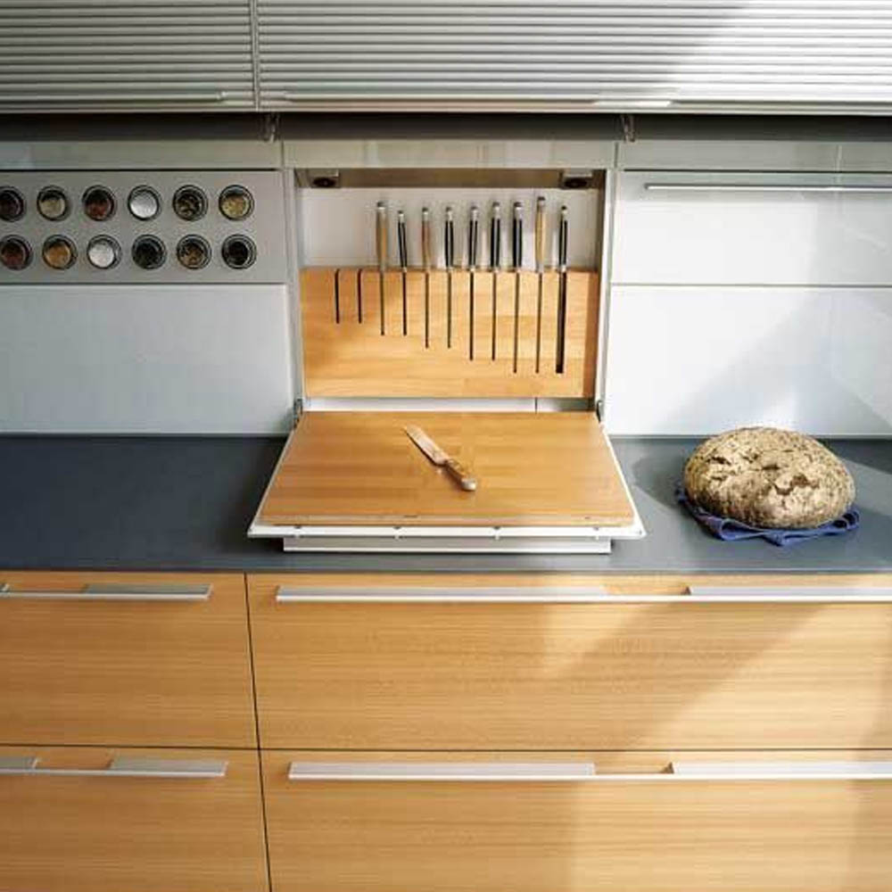 Podobně jako pečicí plechy by měly mít své pevné místo i desky na krájení. Často končí opřené o zeď přímo na pracovní desce. Pokud jich ale časem přibude, každá má jiný účel (maso, zelenina), jejich uložení se změní v nepřehledný chaos.