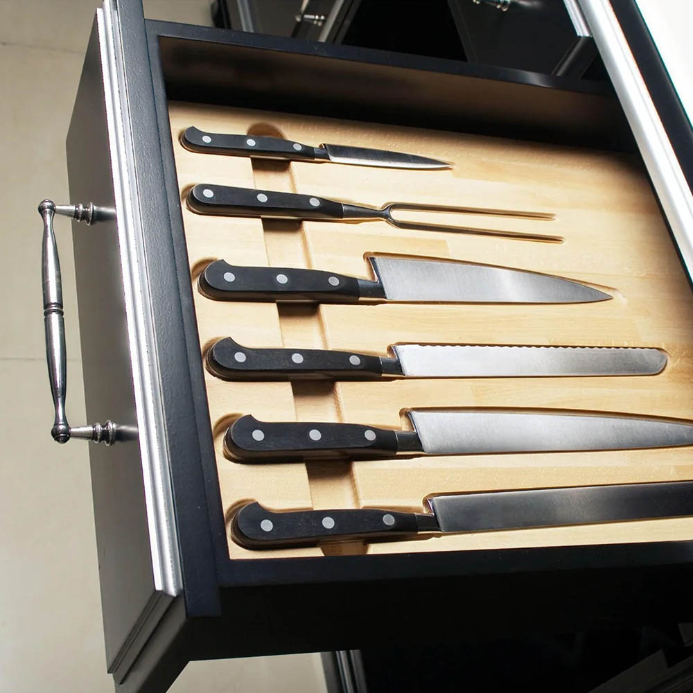 Správné skladování kuchařských nožů výrazně prodlužuje jejich ostrost. Osobně nedoporučuji ukládat nože do zásuvky, a to ani v případě, že je vybavena drážkami na nože, i když do galerie s inspirací ukládám i tyto obrázky.