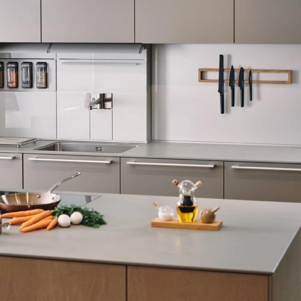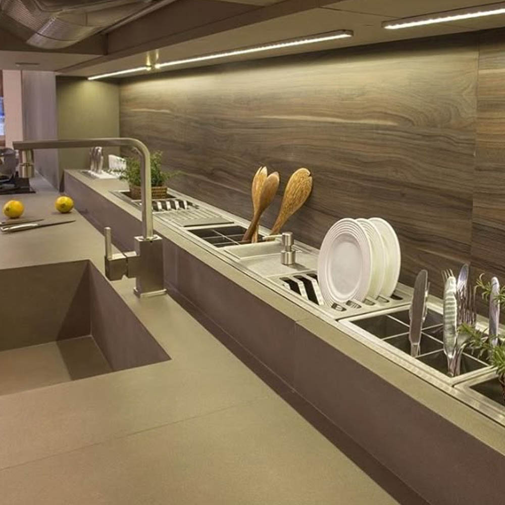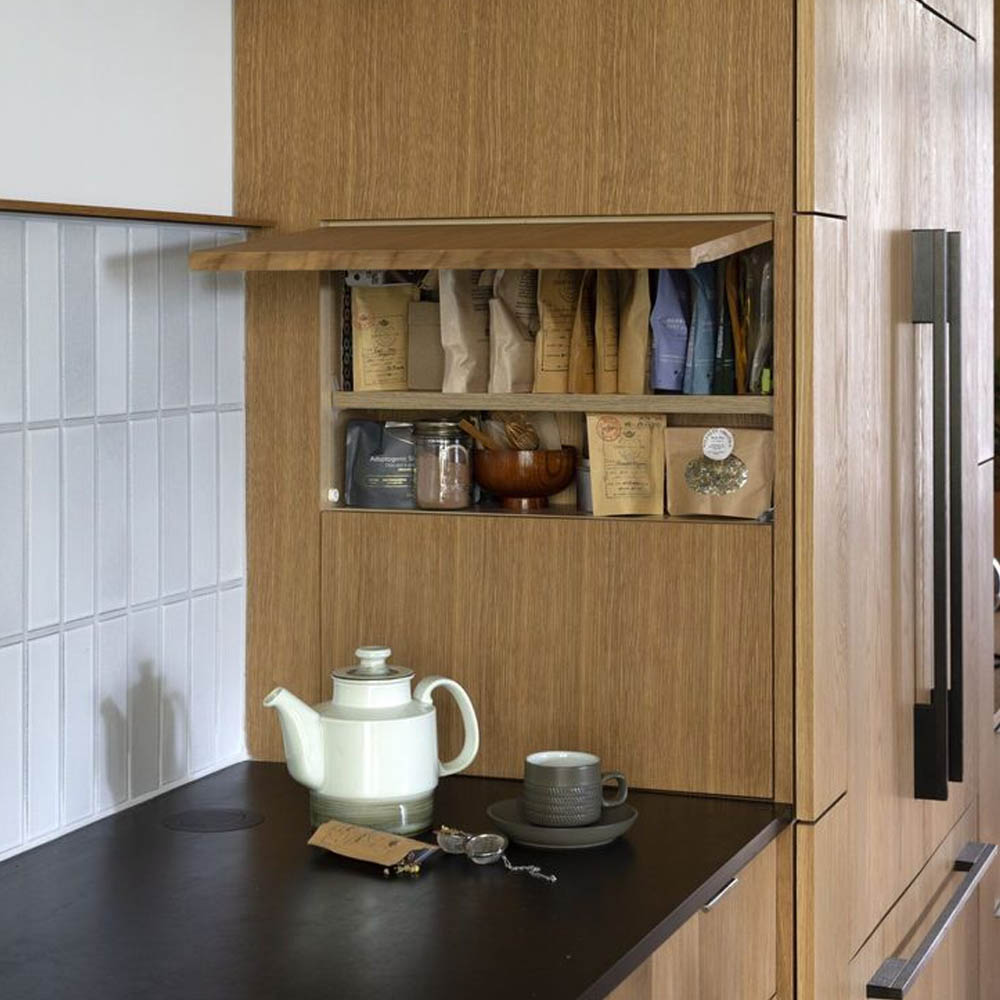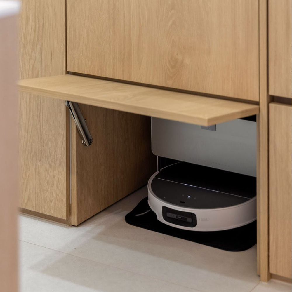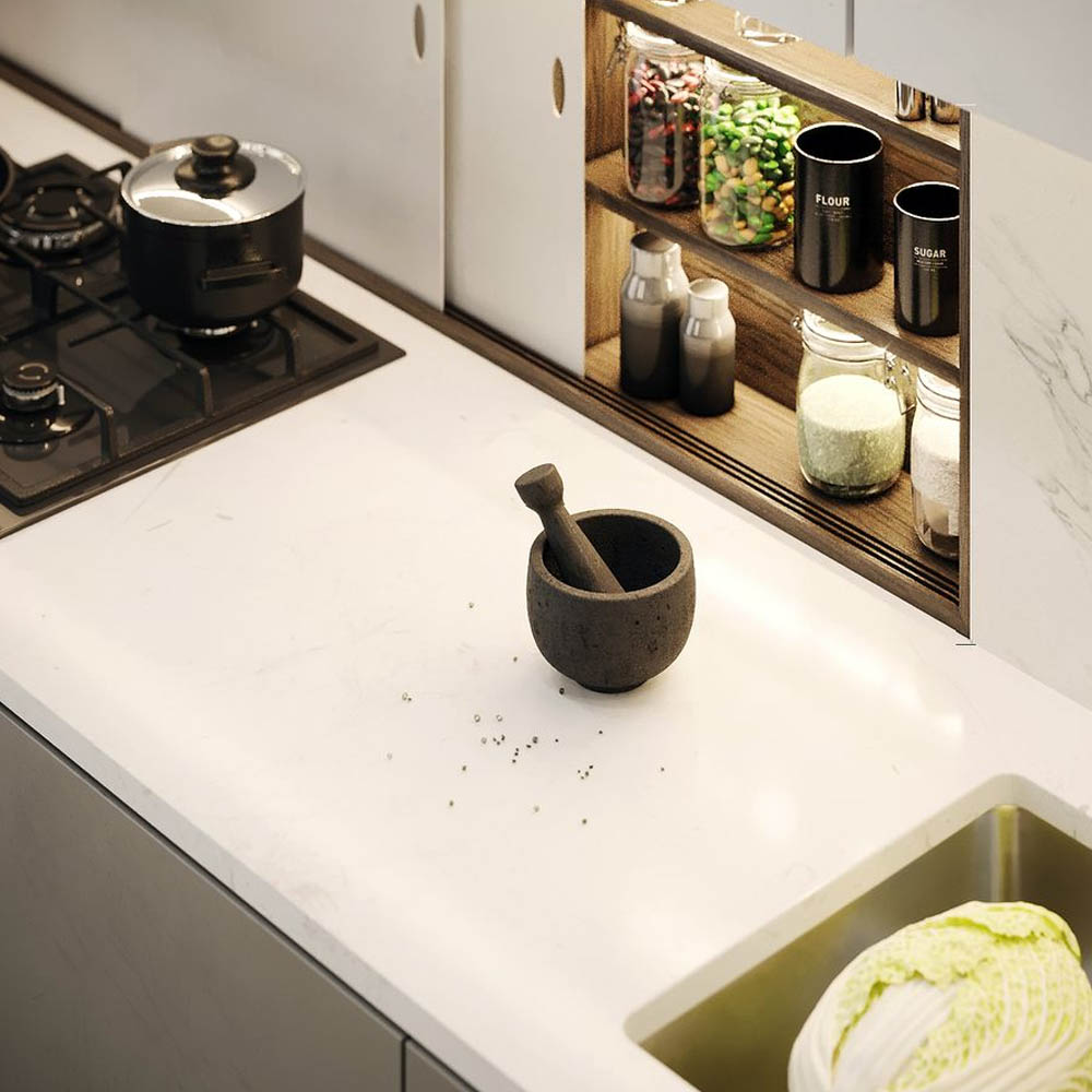 Na pracovní ploše není žádná deska, lze tak plochu pokud se na ní nevaří, využít na běžné kuchyňské práce (krájení, válení těsta, servírování). Celý prostor si tak zachová minimalistický a vzdušný vzhled a působí originálně.