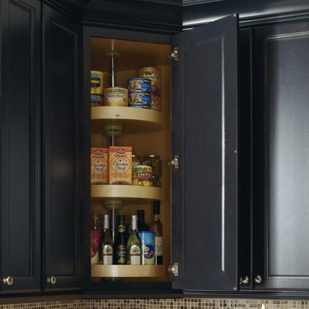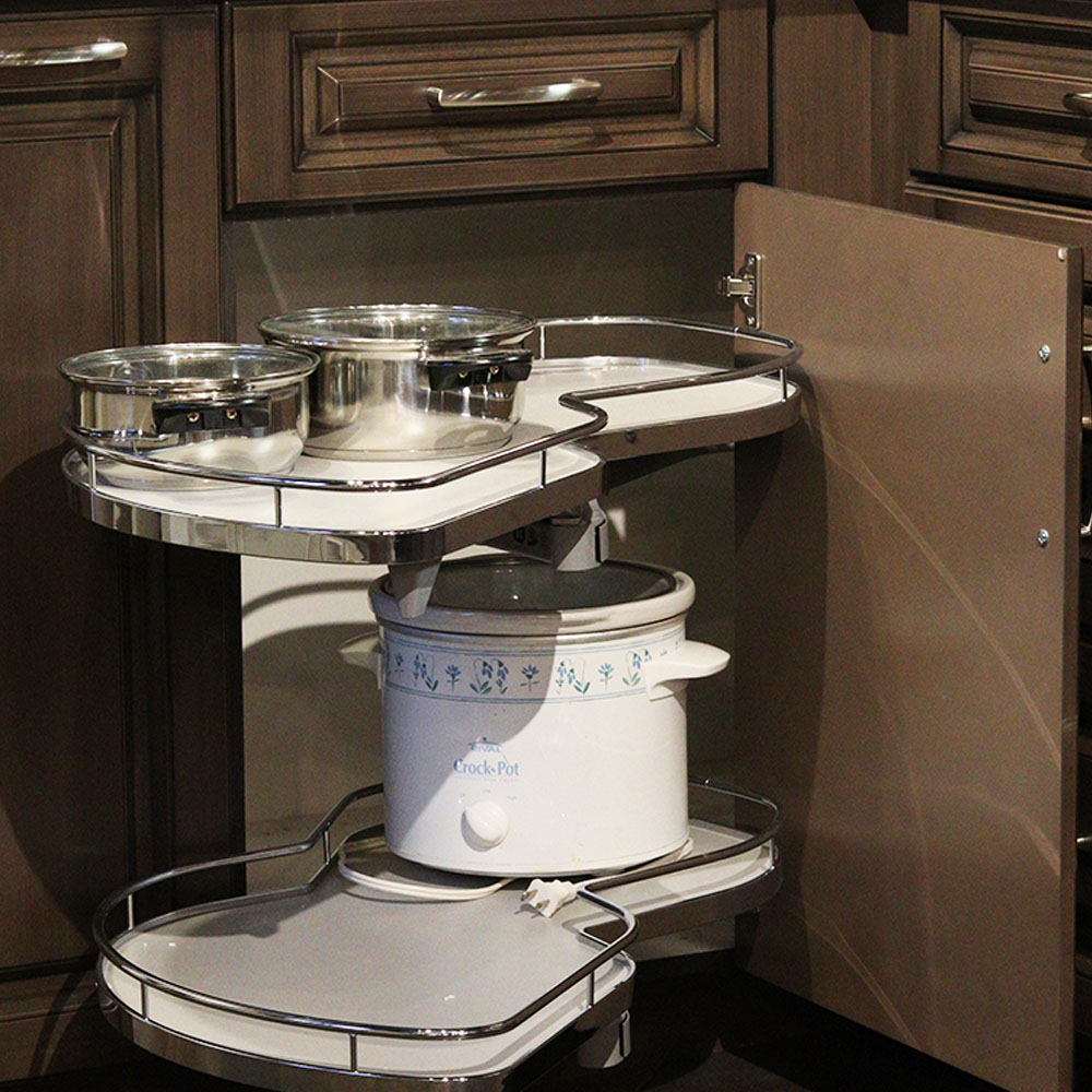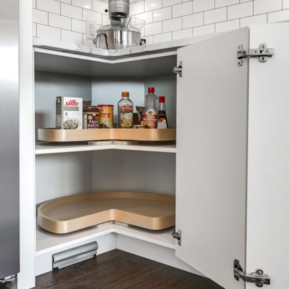 - klasickým karuselem (otočné talíře), který je jednodušší variantou pro lehčí nádobí. I v tomto případě se nevyužije efektivně celý prostor rohové skřínky,