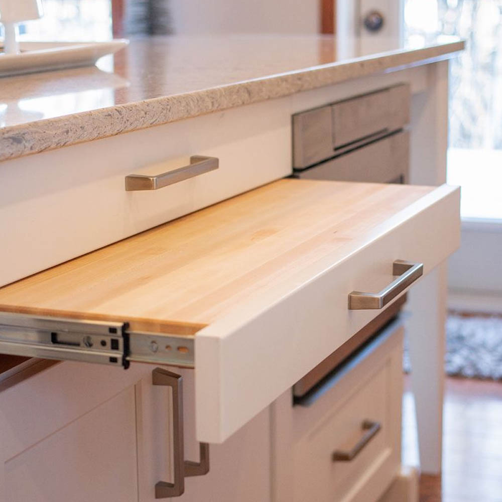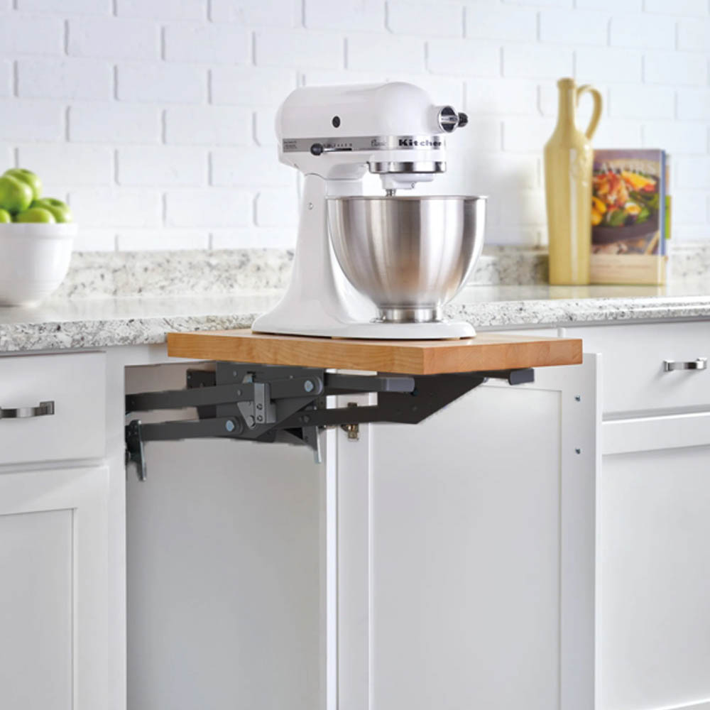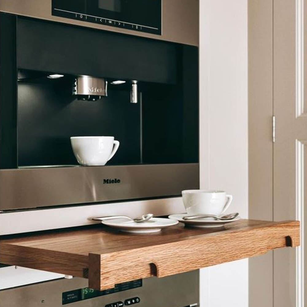 - vysouvací stolík (deska) pod pracovní deskou pro rozšíření pracovní plochy nebo příležitostné stolování