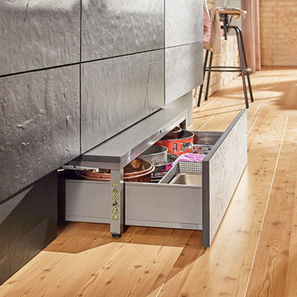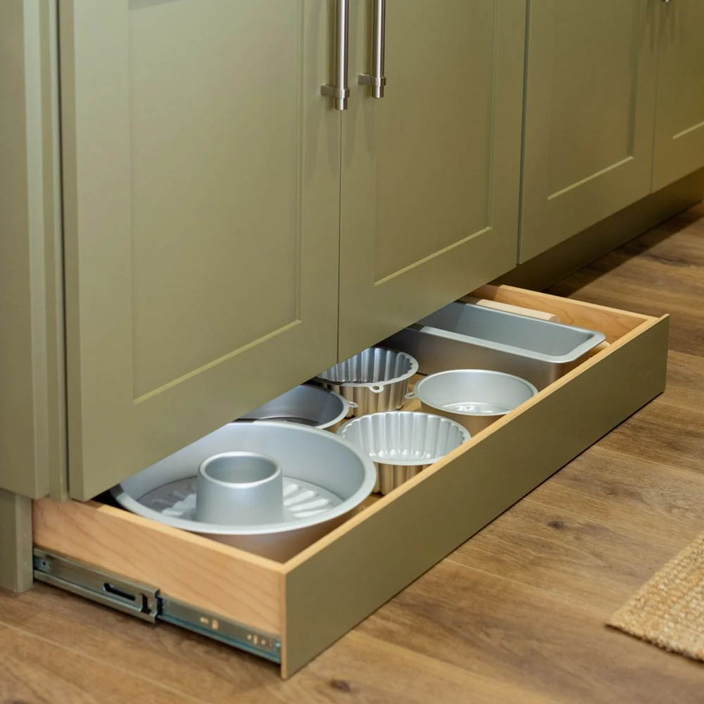 Šuplíky místo klasického soklu pod kuchyňskou linkou představují nenápadný, ale velmi praktický úložný prostor. Jsou ideální na „nezbytnosti“, které nepoužíváme denně, například tvořítka, vykrajovátka, speciální pečicí formy nebo kapsičky pro domácí mazlíčky. Skvěle poslouží také pro skladování pečicích plechů.