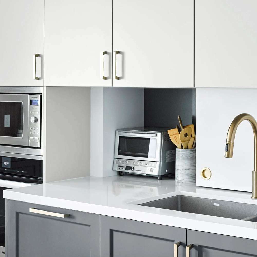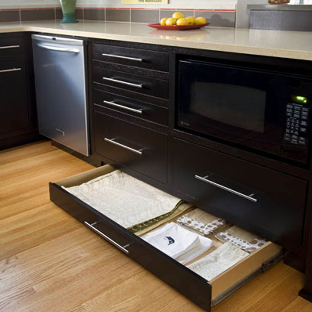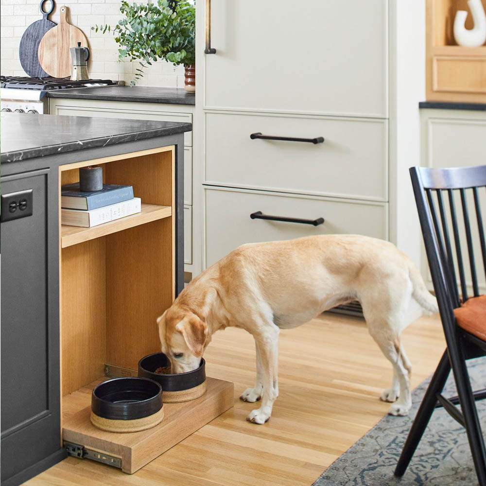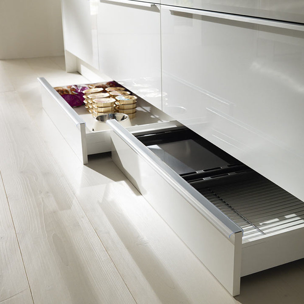 - zásuvky v soklu pro skladování pečicích plechů, utěrek nebo misek s jídlem pro domácí mazlíčky
