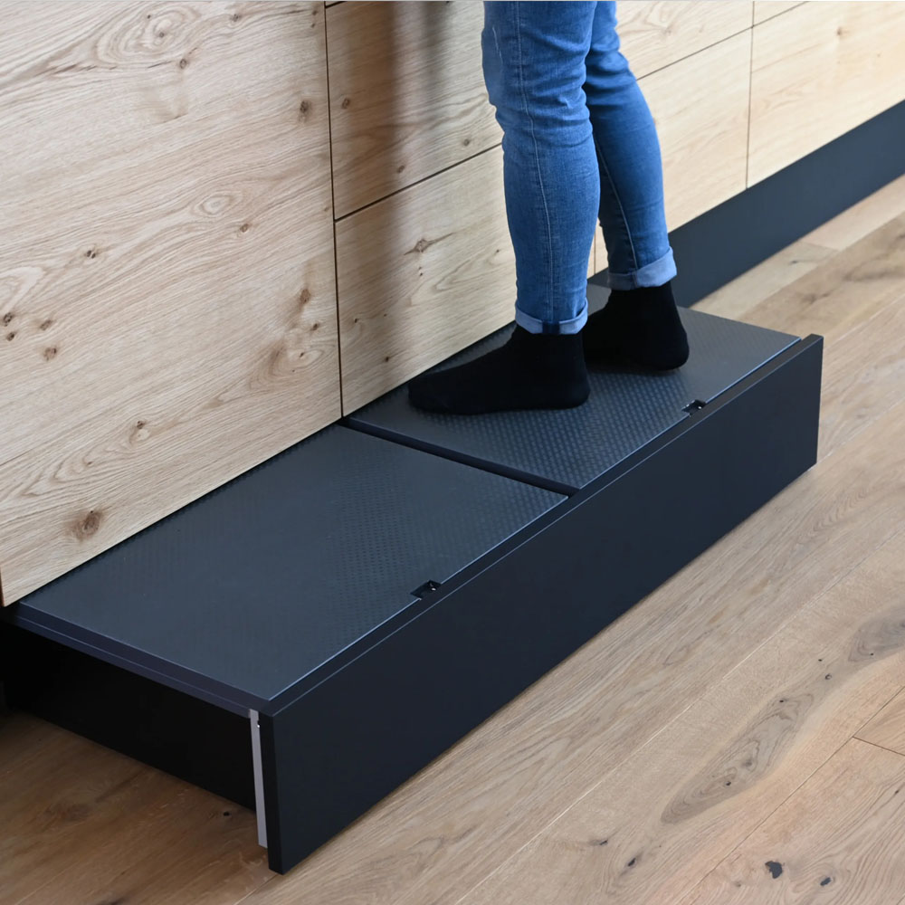 Zajímavým řešením je i výsuvný sokl ve formě stoličky (štokrlete), který ocení zejména ti, kteří při své výšce nedosáhnou do horních skříněk.