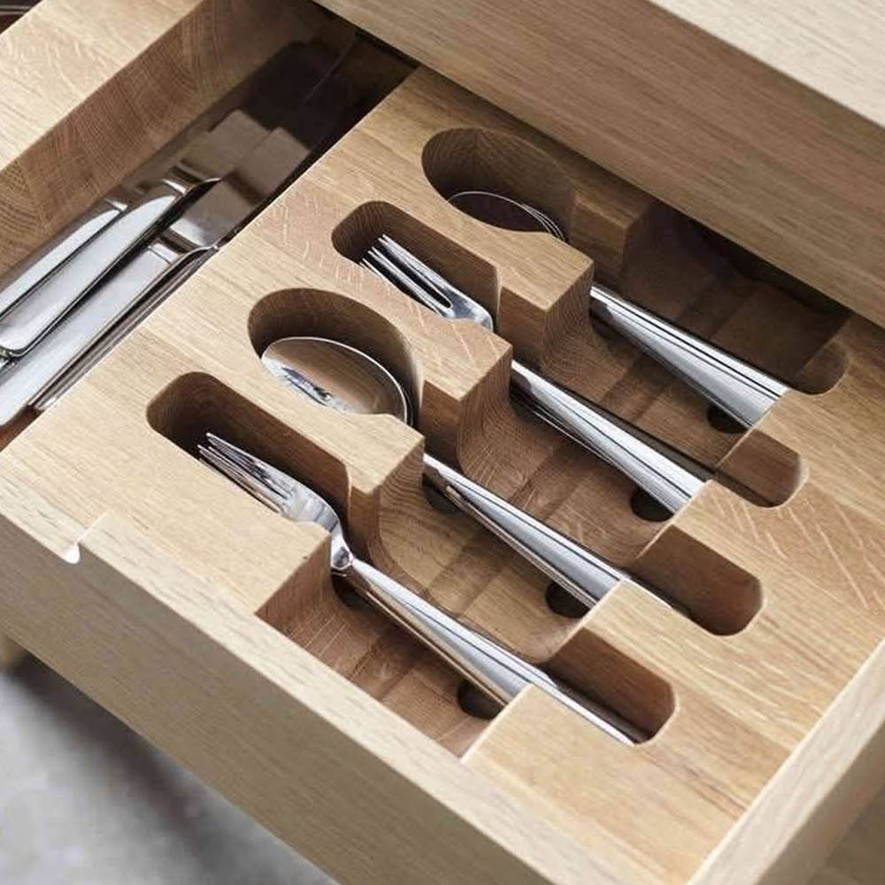 - dostatečně velký organizér na příbory, který pojme alespoň dvě kompletní sady (tedy 12 kusů od každého typu příboru). Lidé často volí příliš úzké zásuvky a příbory se pak „přelévají“ z jednoho oddílu do druhého,