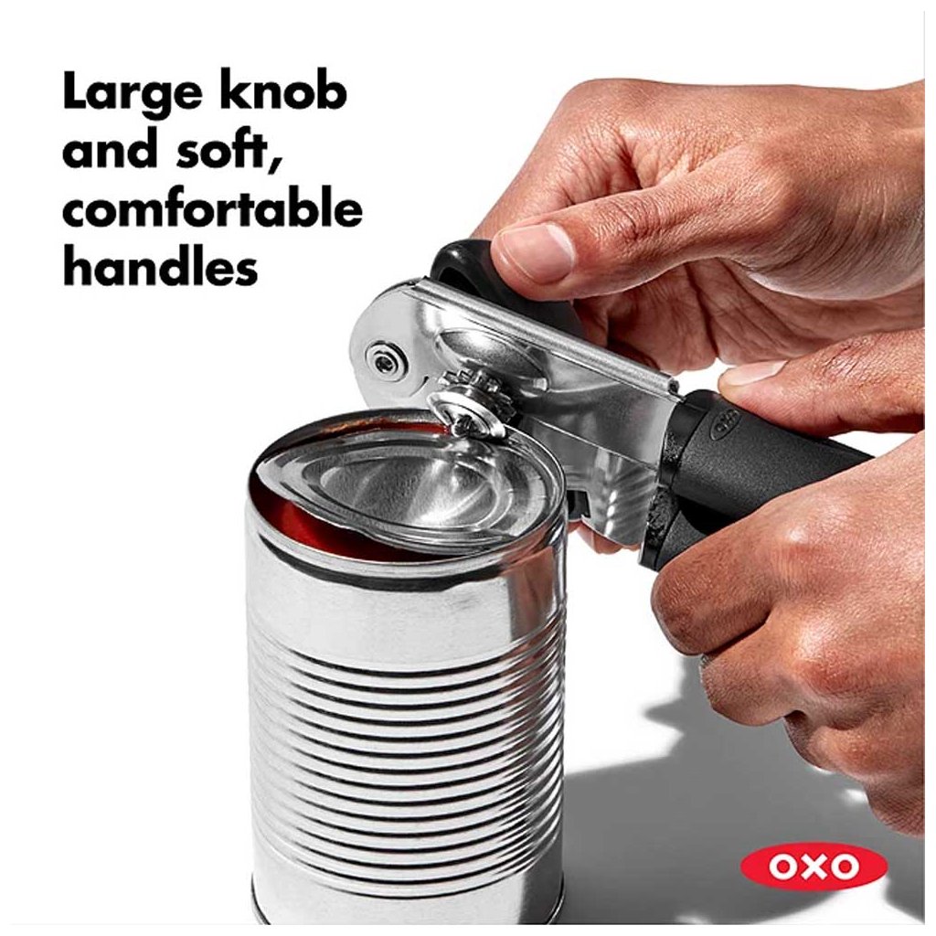 Nerezový otvírák konzerv OXO Good Grips s velkým otočným mechanismem pro pohodlné a snadné otáčení. Široké protiskluzové rukojeti s měkkým úchopem výborně padnou do ruky a jsou opatřeny protiskluzovými prvky. Výhodou je integrovaný otvírák korunkových uzávěrů.