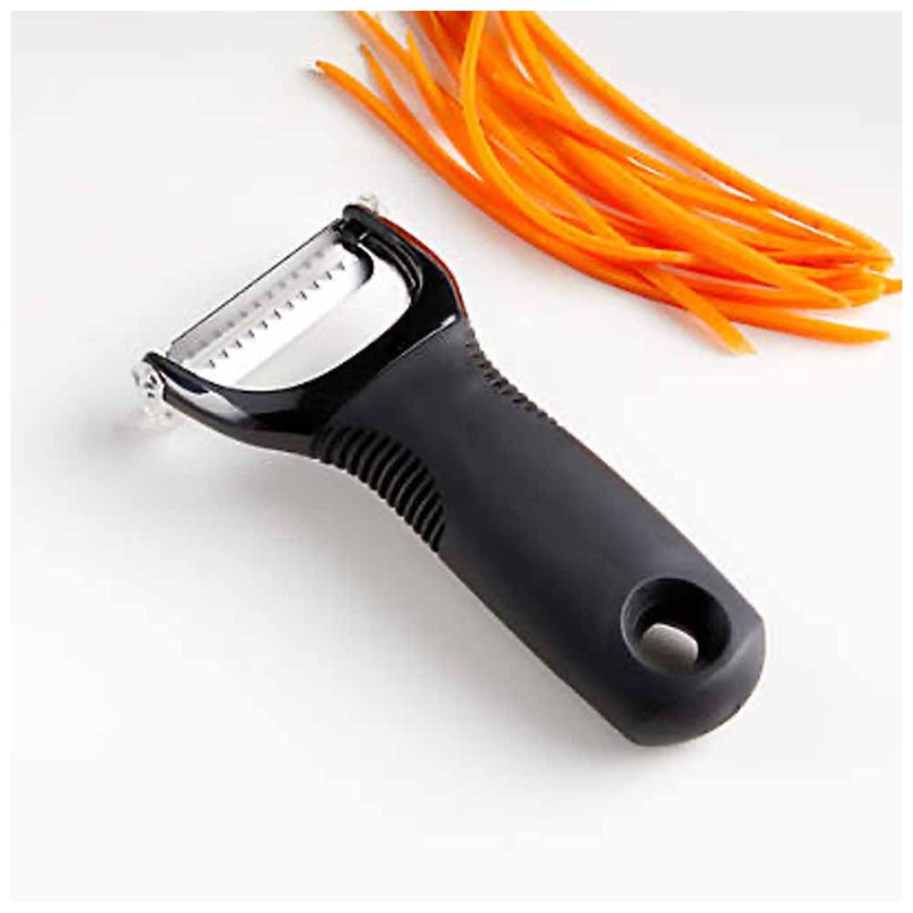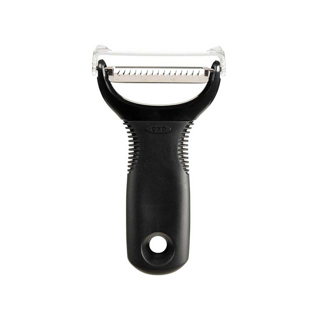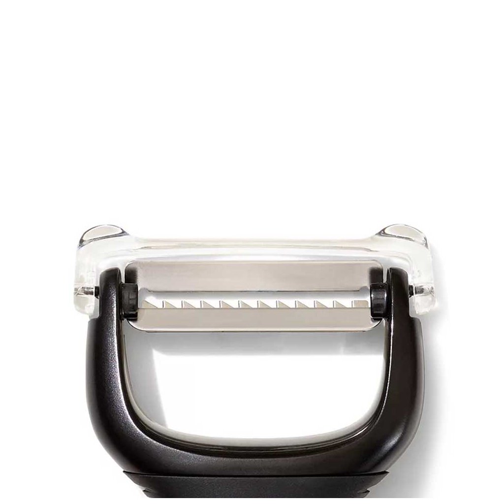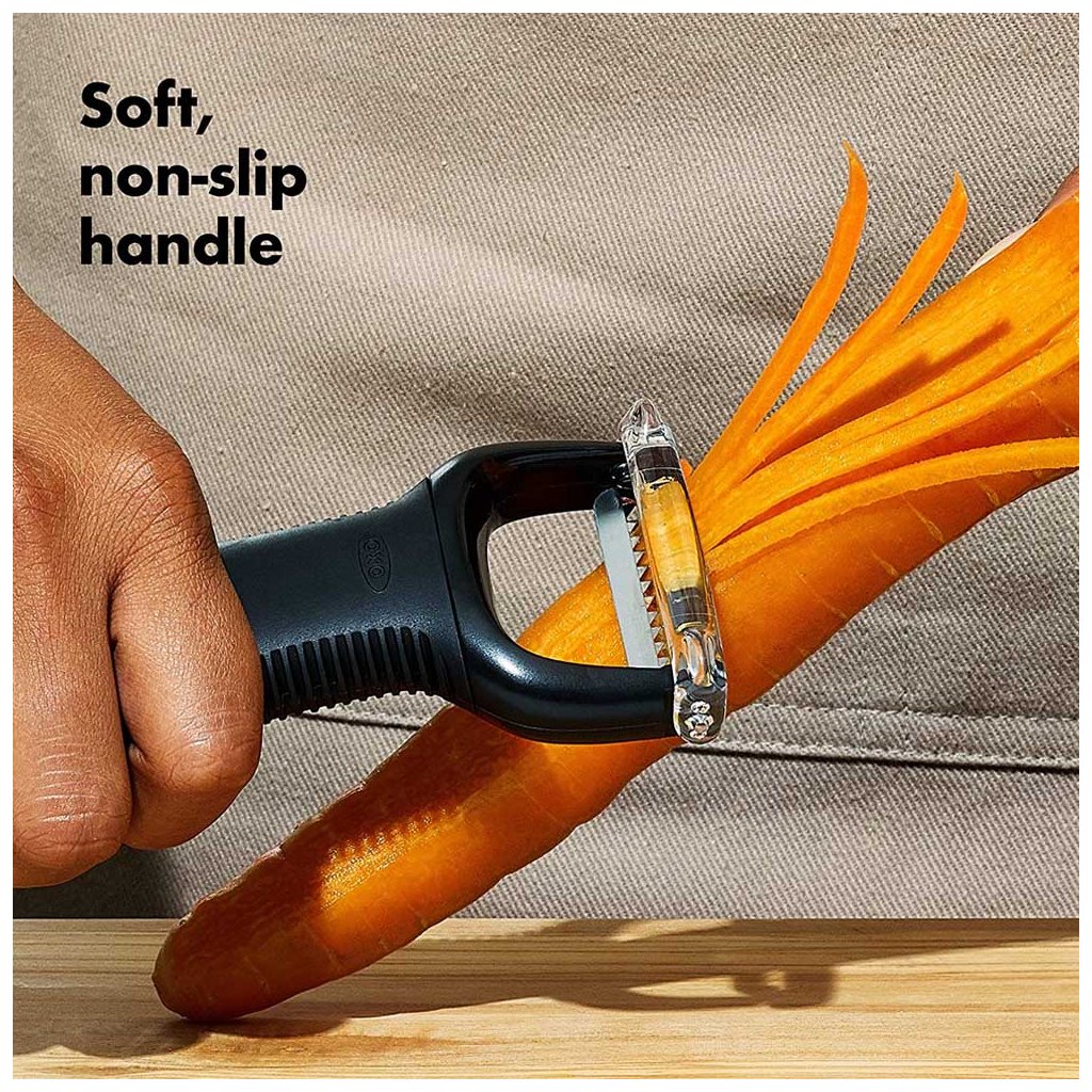 Pohodlná a praktická příčná škrabka Julienne na tenké proužky zeleniny i ovoce od značky Oxo Good Grips má tvar písmene "Y". Jak již název značky napovídá "Good Grips - dobré úchopy", má příjemný a měkký úchop protiskluzové rukojeti, který neklouže, ani když máte mokré ruce a mírní nárazy a předchází únavě i při opakovaných pohybech při loupání.