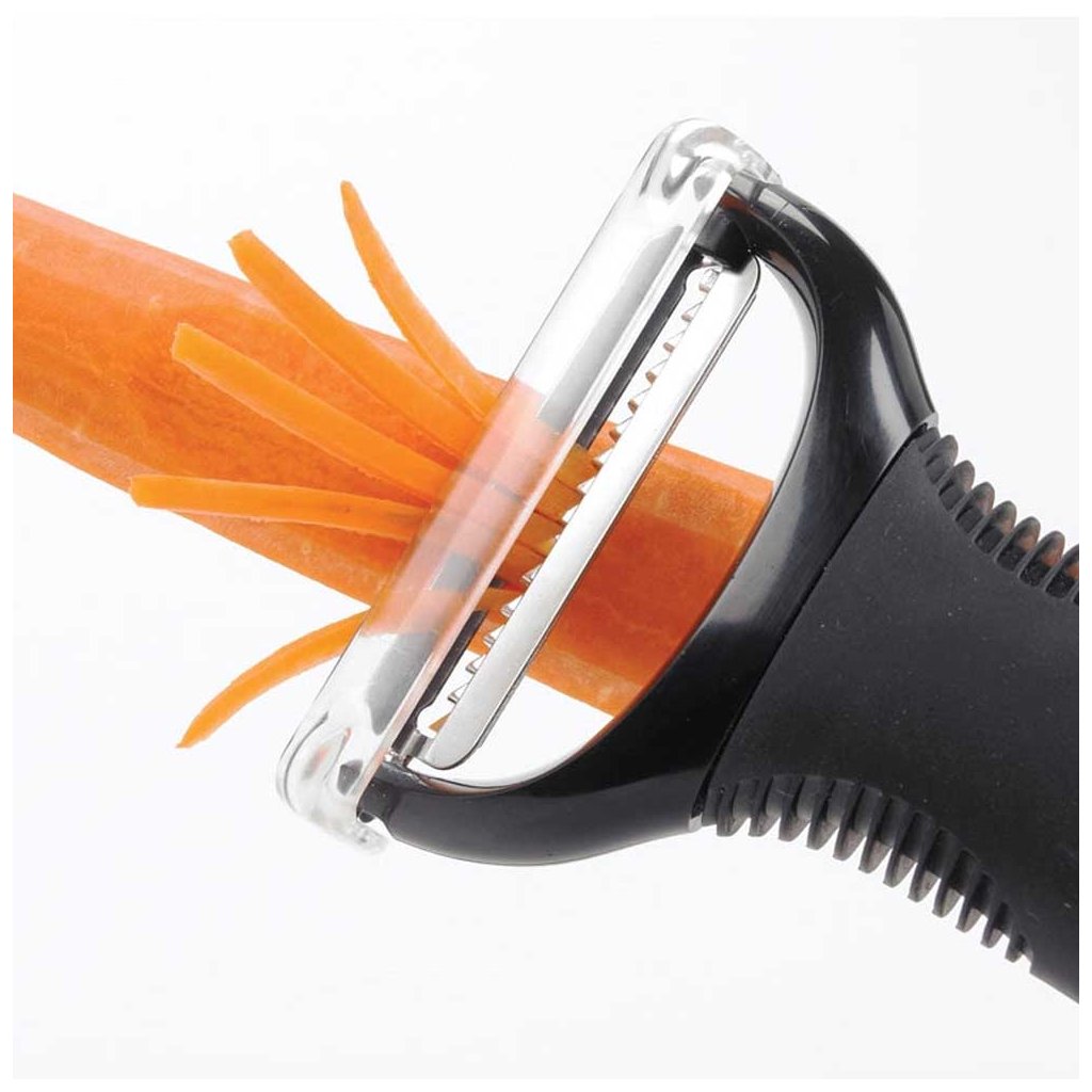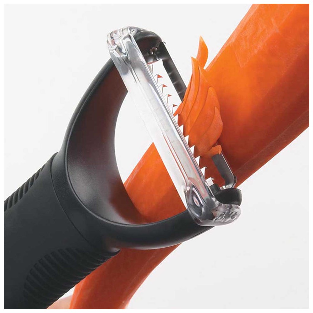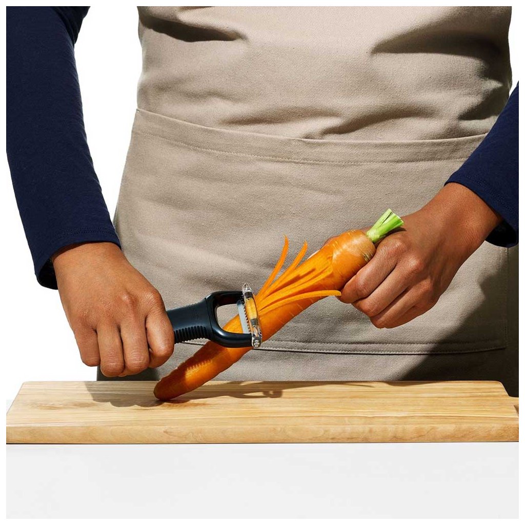 Praktická příčná škrabka JULIENNE na zeleninu i ovoce od značky OXO Good Grips je jednoduchá škrabka ve tvaru písmena "Y", kterou jsme nejčastěji používali v michelinské restauraci Story v Londýně. Během chvilky pomocí této škrabky připravíte tenké proužky zeleniny nebo ovoce. Díky protiskluzové rukojeti, která snižuje tlak na ruku, padne skvěle do každé ruky a velice jednoduše se se škrabkou pracuje. Je vhodná na pohodlné, rychlé a bezpečné loupání zeleniny a ovoce.