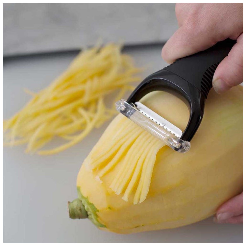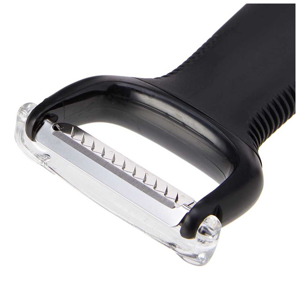Ostrá obostranná čepel je vyrobena z tvrzené japonské nerezové oceli a pyšní se dokonalou ostrostí. Táto část škrabky je pohyblivá a tak dokonale kopíruje zeleninu či ovoce, takže každým tahem se připraví vícero stejně úzkých proužků. Skvělé na zdobení i do ovocných a zeleninových salátů. Se škrabkou se pracuje velice jednoduše, rychle a pohodlně.