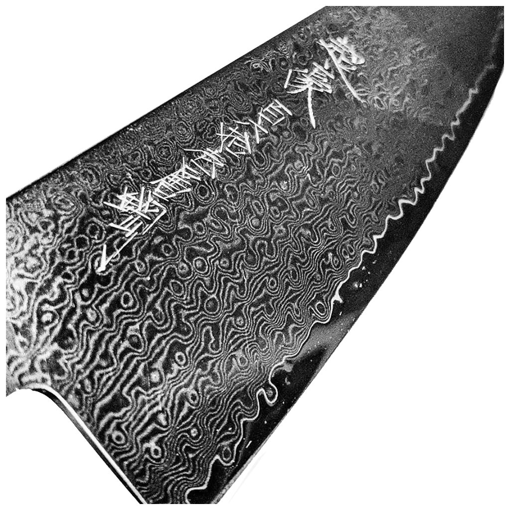 Čepel nože, která je ozdobena ručně tepaným logem "Santoku" v japonštině, se skládá ze 69 vrstev damascénské oceli s enormně odolným jádrem z nerez oceli VG 10 o tvrdosti HRC 60-61.