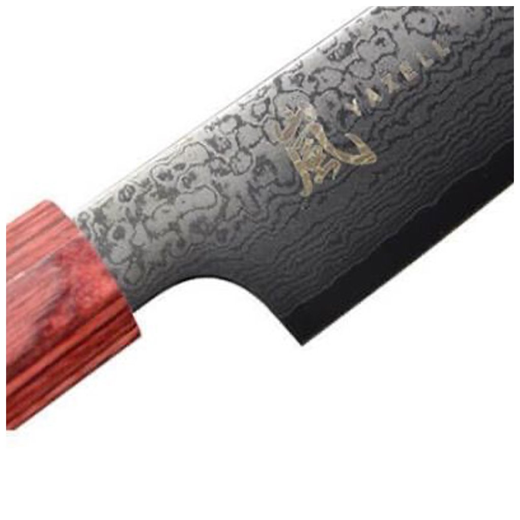 Profesionální japonský kuchařský nůž YAXELL REI Santoku, s délkou čepele 165 mm, je univerzálním tvarem kuchařského nože v domácnosti i v profesionální kuchyni. Čepel nože je vyrobena ze 69 vrstev damascénské oceli. Její jádro VG10 má povrchovou úpravu DLC (Diamond-Like Carbon), která zvyšuje tvrdost extrémních 70 HRC, chrání nůž před poškrábáním i korozí a dává čepeli nádhernou těmně černou barvu. Je vyroben v Japonsku.
