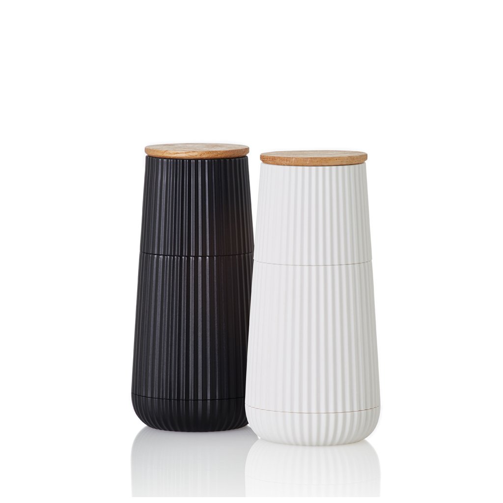 Sada originálních designových mlýnků SCAPE od německé značky AdHoc obsahuje dva mlýnky vyrobené z kvalitního plastu s dřevěnými víčky. Mlýnky lze využít na pepř a hrubozrnnou sůl, různé druhy pepře nebo jiné koření, jako je například nové koření či kmín.