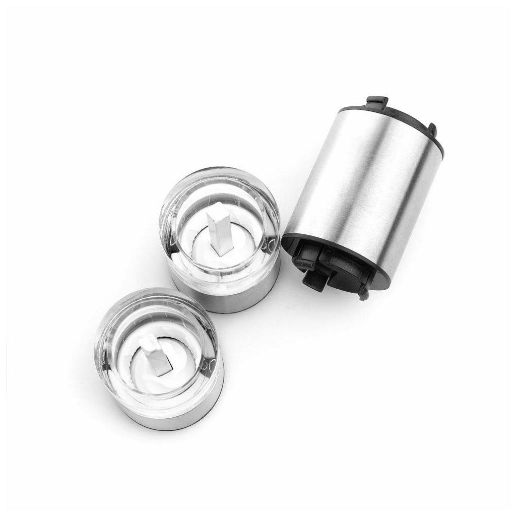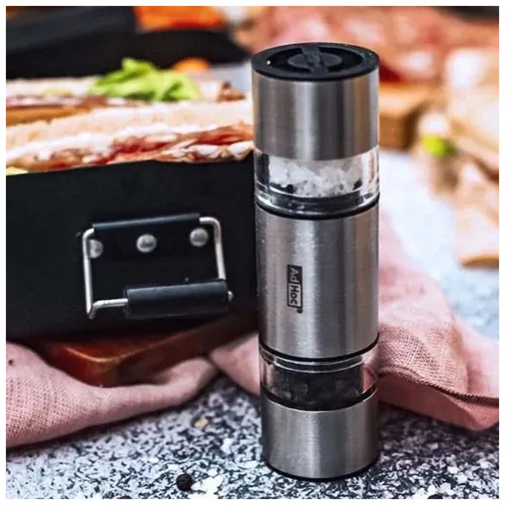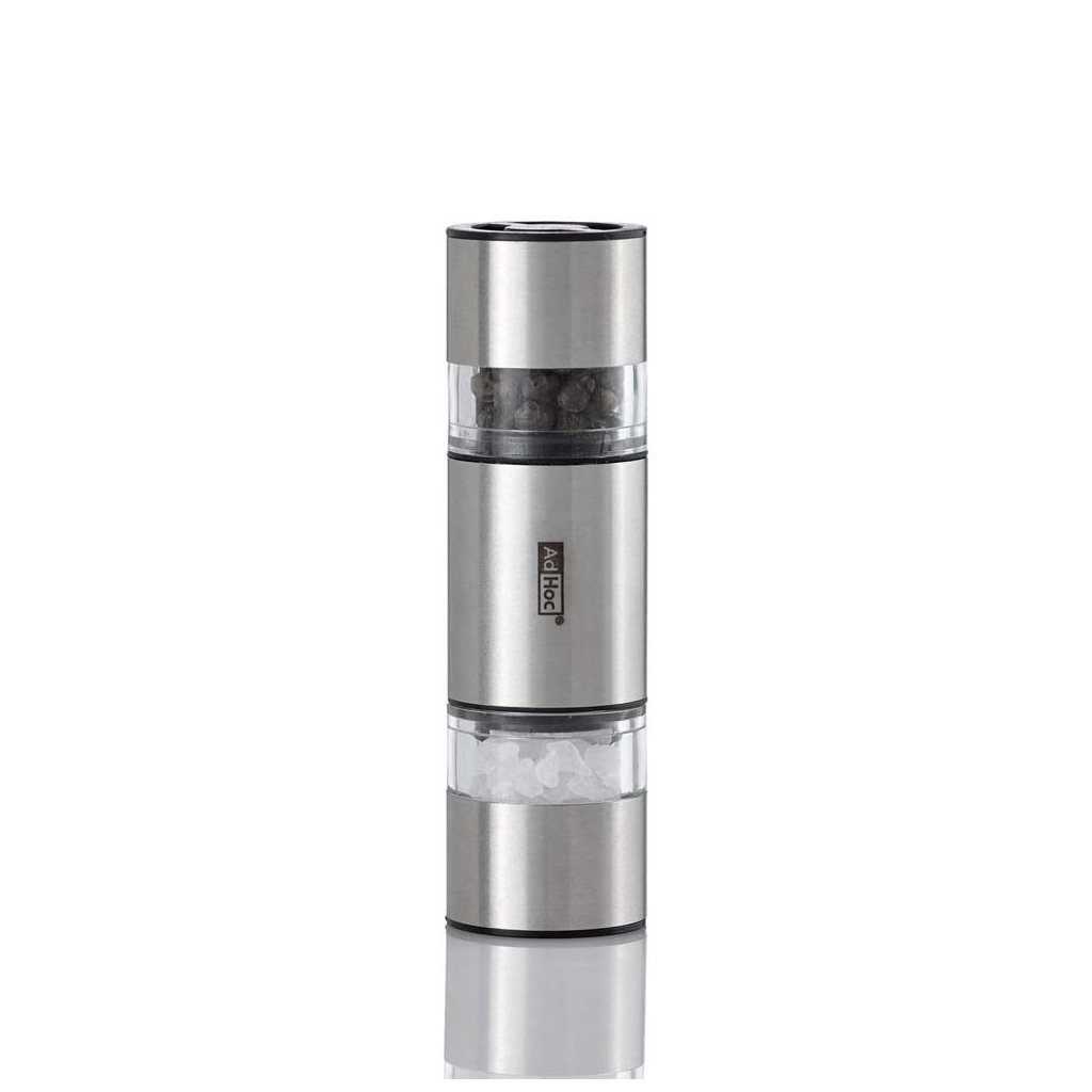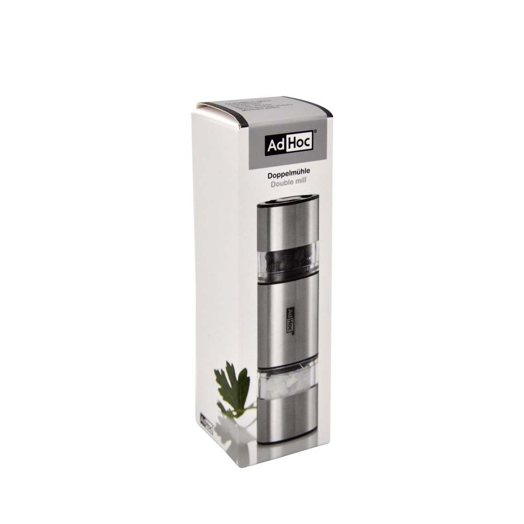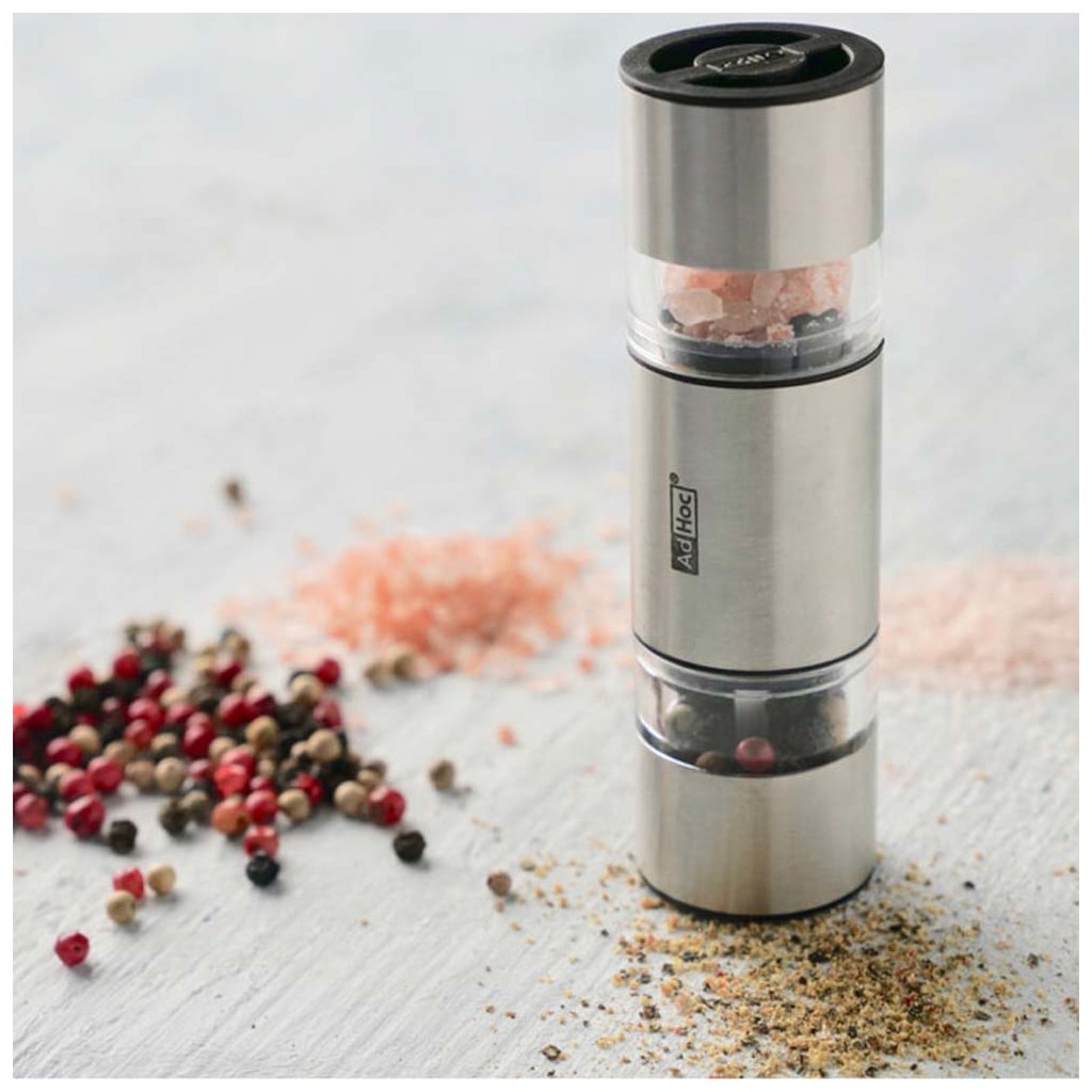 Praktický nerezový oboustranný ruční mlýnek Duomill Mini od německé značky AdHoc využijete na namletí pepře z jedné strany a hrubozrnné soli (nebo jiné barvy pepře) ze strany druhé. Prostě sůl i pepř v jednom mlýnku! Rozlišení stran je viditelné přes akrylové otvory.