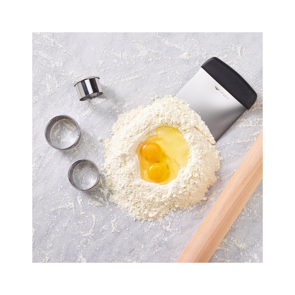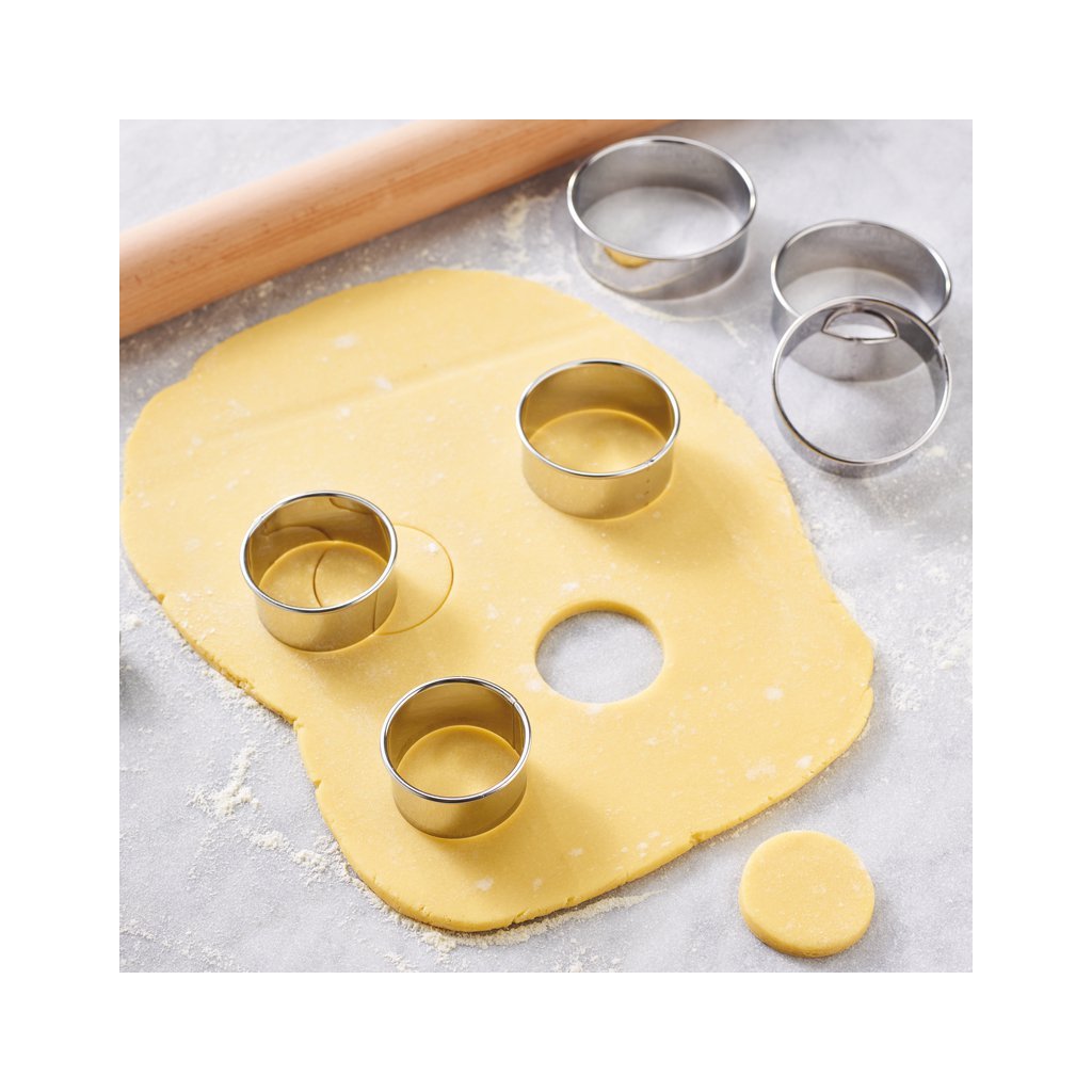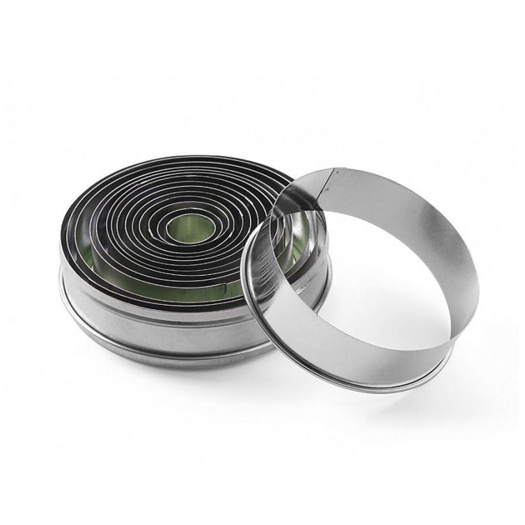 Profesionální cukrářská sada nerezových kruhových vykrajovátek v praktické dóze. Sada obsahuje 14 kusů nerezových kruhů s průměrem od 2,5 cm až do 11,5 cm, s jednotnou výškou 3 cm. Vykrajovátka využijete v kuchyni na vykrajování kruhů z těsta, při přípravě těstovin nebo servírování pokrmů na talíř.