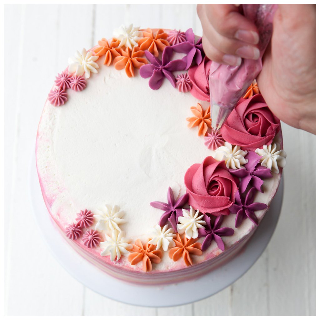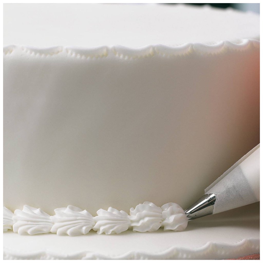 - Těsně před zdobením uvolněte igelit ze zdobicí špičky a jemným zatlačením posuňte krém na konec cukrářského sáčku.