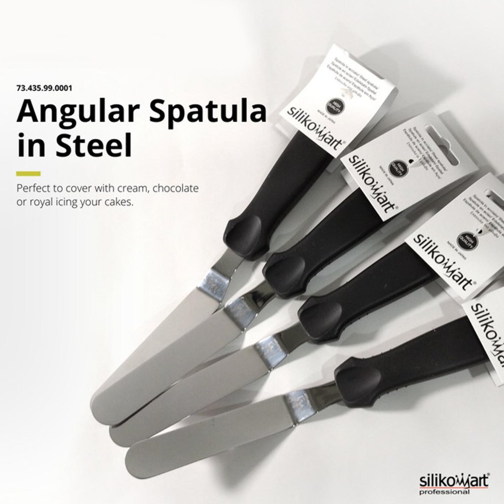 Nerezová zalomená cukrářská špachtle s délkou čepele 9 cm od italské značky Silikomart je skvělá pomůcka při vrstvení a detailním uhlazení krému na dortech a zákuscích. Lze ji využít i jako šikovnou pomůcku na otáčení lívanců nebo palačinek.