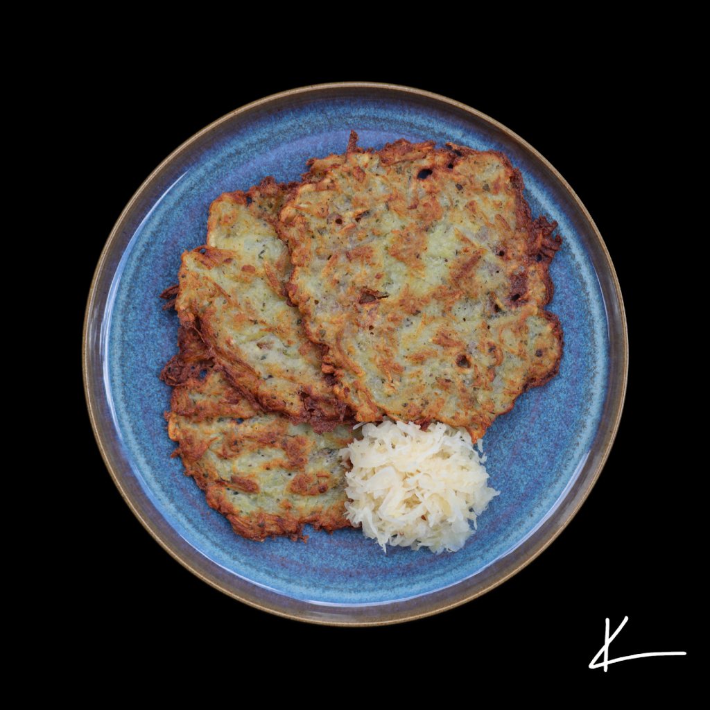 Na pánvi rozehřeji olej a pomocí velké lžíce nebo naběračky vytvaruji z bramborového těsta placku, kterou opeču rovnoměrně z obou stran dozlatova. První ochutnám a dle potřeby směs dochutím (dochucuji ji vždy!). Pokud by byla první placka příliš moučná a tuhá, přiliji do směsi mléko, promíchám a dál testuji. Pak už ale nevečeřím :).