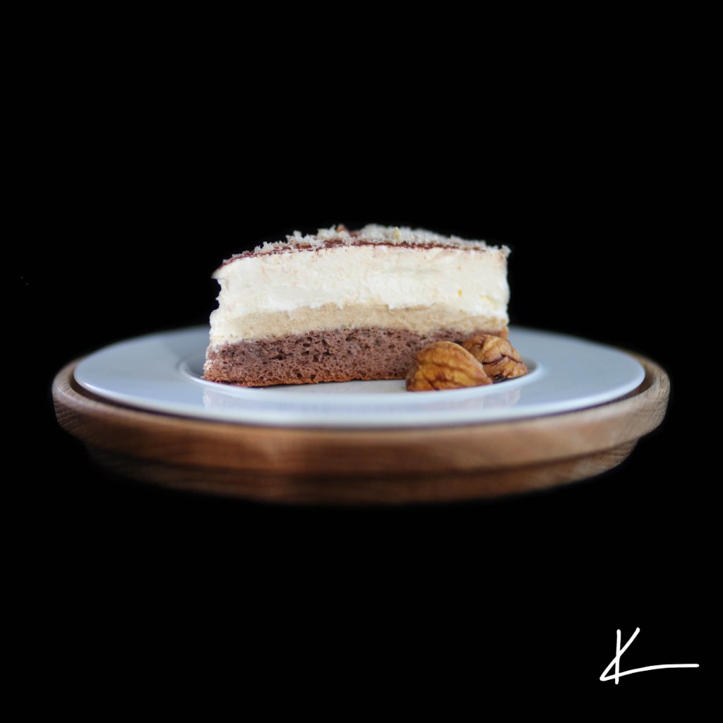 Na krém nechám povolit další kostku kaštanového pyré. Ve větší míse si vyšlehám jednu smetanu do tuhé šlehačky, přidám semínka z vanilkového lusku nebo balíček vanilkového cukru a postupně vše promíchám. Pro zatmavení krému a zvýraznění této vrstvy krému při finálním řezu dortu můžu přidat půl až celou lžičku holandského kakaa. Hotové kaštanové pyré je slazené a tak krém dosladím cukrem dle sebe. Vše promíchám a zapracuji do šlehačky. Hotový krém navrstvím a uhladím stěrkou na upečený a vychlazený kaštanový korpus.