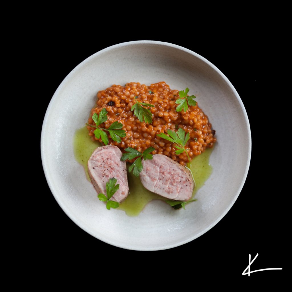 V hluboké pánvi si na olivovém oleji opeču nadrobno nasekanou šalotku a pak k ní přidám nasekaný stroužek česneku. Přidám lístky tymiánu, tarhoňu (nevařenou), vše důkladně promíchám a opeču přibližně minutu až dvě. Poté přimíchám rajčatový protlak, lžíci povidel, na menší kousky nakrájené sušené švestky a vše zaliju červeným vínem. Nechám alkohol z pánve odpařit (zabere mi to přibližně 2 minuty) a zaliju dvěma naběračkami vývaru, aby byla tarhoňa celá ponořená.