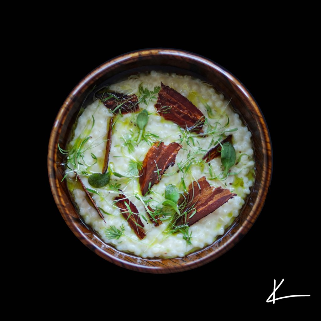 Krémové tarhoto servíruji do menšího a hlubšího talíře (misky) a rukou zespoda talíře poklepu, aby se rozprostřelo po celé ploše. Přidám kousky křupavých slaninových chipsů, dozdobím čerstvými bylinkami a zakápnu bylinkovým olejem.