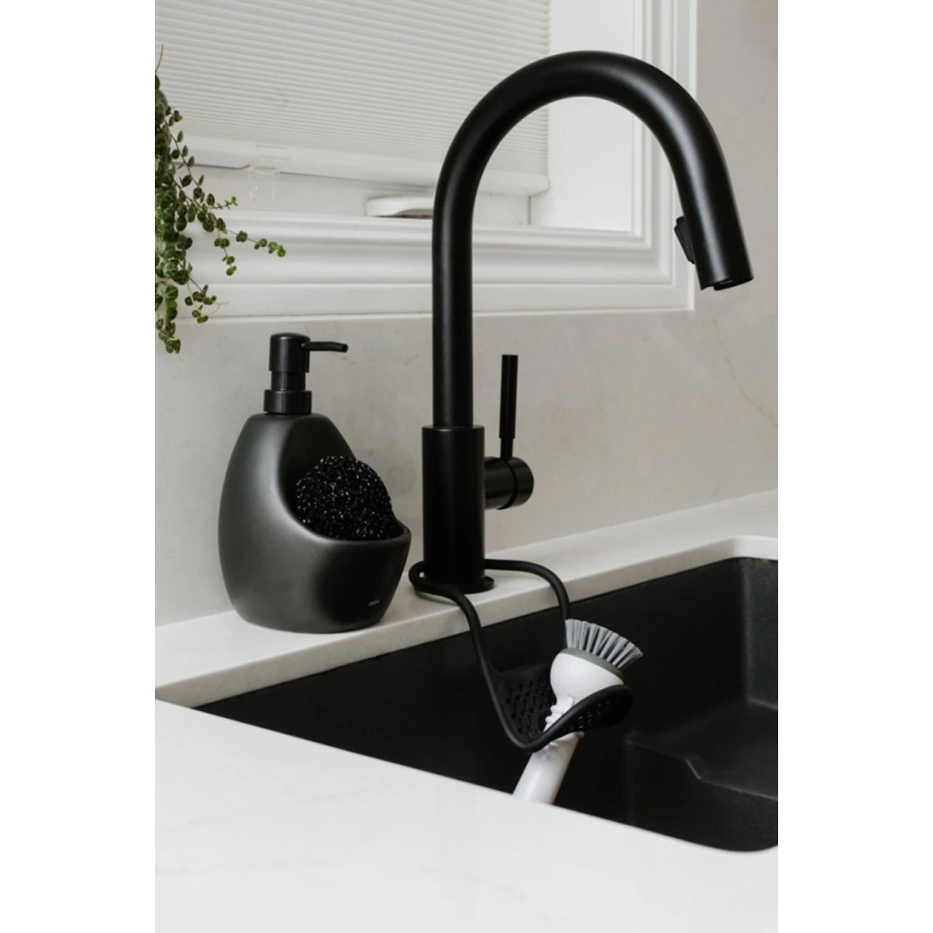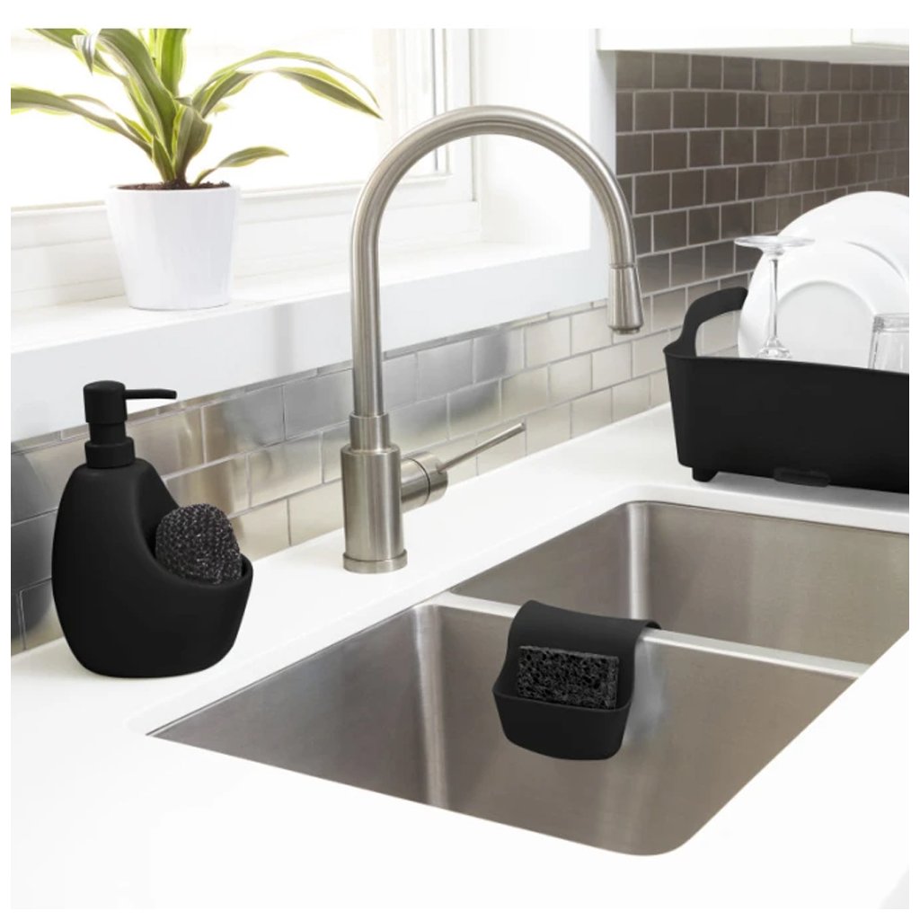 Vestavěný úložný prostor poskytuje místo pro houbičku, která je součástí balení. Uložit do prostoru lze kartáček, gumičky, sponky či další drobnosti, které chcete mít po ruce během mytí. Minimalistický design Joey působí elegantně na kuchyňské lince i v koupelně a přitom zabírá jen minimum místa.