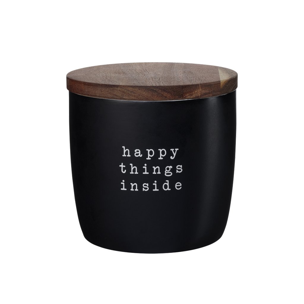 Bílý nápis Happy Things Inside, v překladu "Šťastné věci uvnitř", napovídá, co se může skrývat pod víkem v designové dóze. Nádoba je univerzální, dostupná ve dvou velikostech a hodí se jak na čerstvě upečené sušenky, tak na ořechy a jiné dobroty.